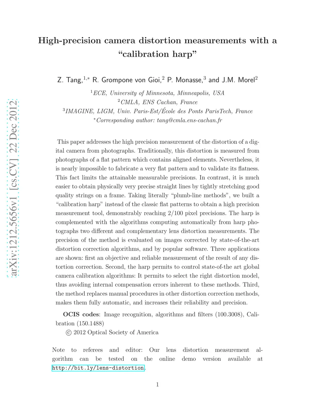 This paper addresses the high precision measurement of the distortion of a digital camera from photographs. Traditionally, this distortion is measured from photographs of a flat pattern which contains aligned elements. Nevertheless, it is nearly impossible to fabricate a very flat pattern and to validate its flatness. This fact limits the attainable measurable precisions. In contrast, it is much easier to obtain physically very precise straight lines by tightly stretching good quality strings on a frame. Taking literally "plumb-line methods", we built a "calibration harp" instead of the classic flat patterns to obtain a high precision measurement tool, demonstrably reaching 2/100 pixel precisions. The harp is complemented with the algorithms computing automatically from harp photographs two different and complementary lens distortion measurements. The precision of the method is evaluated on images corrected by state-of-the-art distortion correction algorithms, and by popular software. Three applications are shown: first an objective and reliable measurement of the result of any distortion correction. Second, the harp permits to control state-of-the art global camera calibration algorithms: It permits to select the right distortion model, thus avoiding internal compensation errors inherent to these methods. Third, the method replaces manual procedures in other distortion correction methods, makes them fully automatic, and increases their reliability and precision.