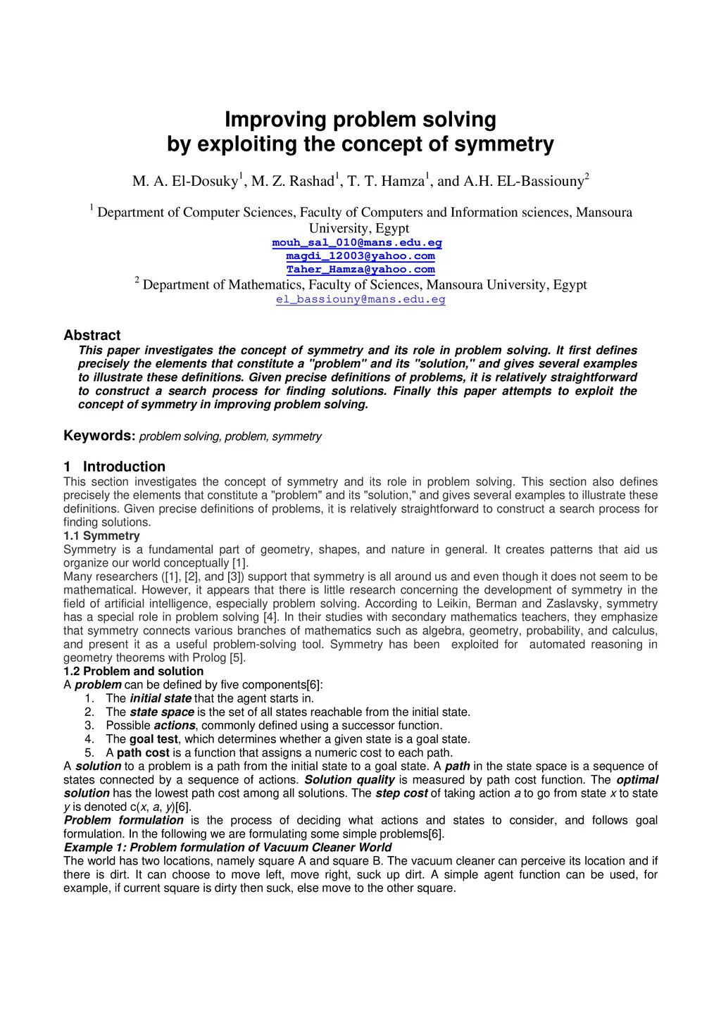 We investigate the concept of symmetry and its role in problem solving. This paper first defines precisely the elements that constitute a "problem" and its "solution," and gives several examples to illustrate these definitions. Given precise definitions of problems, it is relatively straightforward to construct a search process for finding solutions. Finally this paper attempts to exploit the concept of symmetry in improving problem solving.
