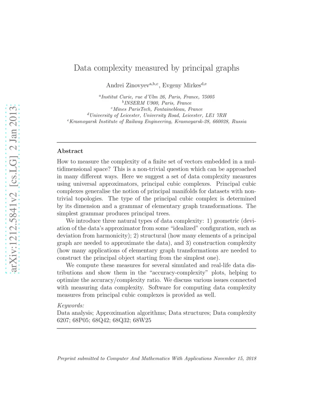 How to measure the complexity of a finite set of vectors embedded in a multidimensional space? This is a non-trivial question which can be approached in many different ways. Here we suggest a set of data complexity measures using universal approximators, principal cubic complexes. Principal cubic complexes generalise the notion of principal manifolds for datasets with non-trivial topologies. The type of the principal cubic complex is determined by its dimension and a grammar of elementary graph transformations. The simplest grammar produces principal trees. We introduce three natural types of data complexity: 1) geometric (deviation of the data's approximator from some "idealized" configuration, such as deviation from harmonicity); 2) structural (how many elements of a principal graph are needed to approximate the data), and 3) construction complexity (how many applications of elementary graph transformations are needed to construct the principal object starting from the simplest one). We compute these measures for several simulated and real-life data distributions and show them in the "accuracy-complexity" plots, helping to optimize the accuracy/complexity ratio. We discuss various issues connected with measuring data complexity. Software for computing data complexity measures from principal cubic complexes is provided as well.