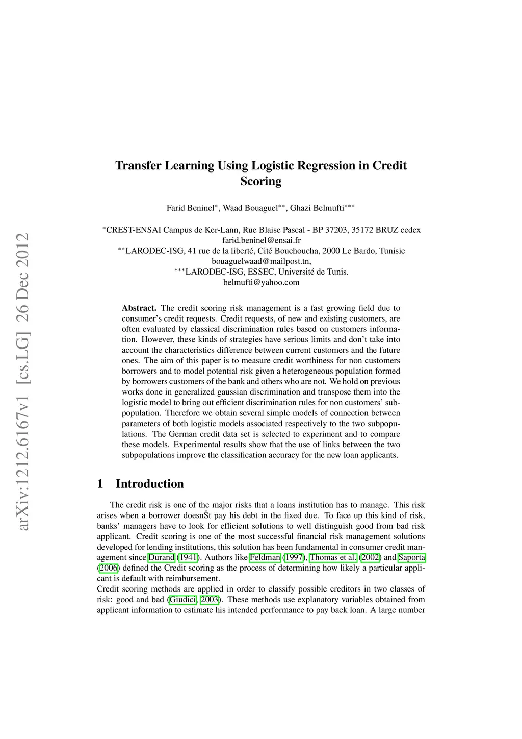 The credit scoring risk management is a fast growing field due to consumer's credit requests. Credit requests, of new and existing customers, are often evaluated by classical discrimination rules based on customers information. However, these kinds of strategies have serious limits and don't take into account the characteristics difference between current customers and the future ones. The aim of this paper is to measure credit worthiness for non customers borrowers and to model potential risk given a heterogeneous population formed by borrowers customers of the bank and others who are not. We hold on previous works done in generalized gaussian discrimination and transpose them into the logistic model to bring out efficient discrimination rules for non customers' subpopulation. Therefore we obtain several simple models of connection between parameters of both logistic models associated respectively to the two subpopulations. The German credit data set is selected to experiment and to compare these models. Experimental results show that the use of links between the two subpopulations improve the classification accuracy for the new loan applicants.