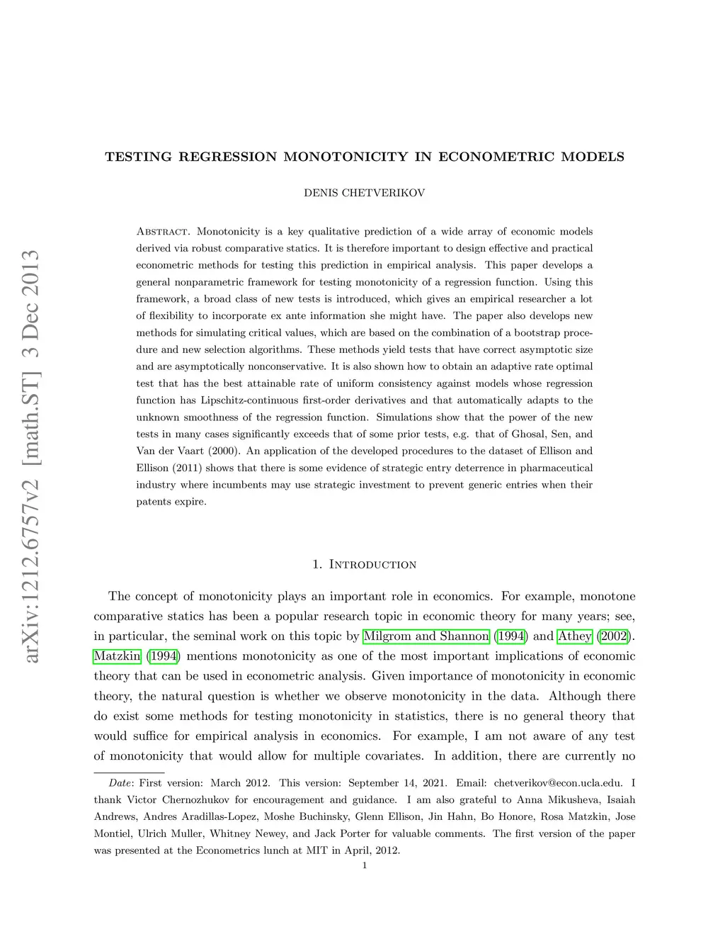 Monotonicity is a key qualitative prediction of a wide array of economic models derived via robust comparative statics. It is therefore important to design effective and practical econometric methods for testing this prediction in empirical analysis. This paper develops a general nonparametric framework for testing monotonicity of a regression function. Using this framework, a broad class of new tests is introduced, which gives an empirical researcher a lot of flexibility to incorporate ex ante information she might have. The paper also develops new methods for simulating critical values, which are based on the combination of a bootstrap procedure and new selection algorithms. These methods yield tests that have correct asymptotic size and are asymptotically nonconservative. It is also shown how to obtain an adaptive rate optimal test that has the best attainable rate of uniform consistency against models whose regression function has Lipschitz-continuous first-order derivatives and that automatically adapts to the unknown smoothness of the regression function. Simulations show that the power of the new tests in many cases significantly exceeds that of some prior tests, e.g. that of Ghosal, Sen, and Van der Vaart (2000). An application of the developed procedures to the dataset of Ellison and Ellison (2011) shows that there is some evidence of strategic entry deterrence in pharmaceutical industry where incumbents may use strategic investment to prevent generic entries when their patents expire.