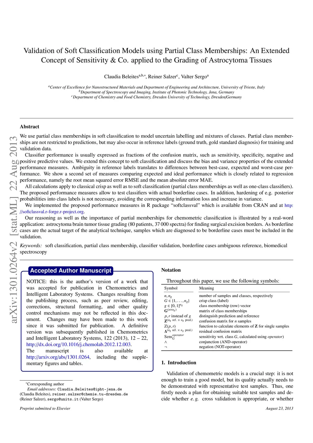 We use partial class memberships in soft classification to model uncertain labelling and mixtures of classes. Partial class memberships are not restricted to predictions, but may also occur in reference labels (ground truth, gold standard diagnosis) for training and validation data. Classifier performance is usually expressed as fractions of the confusion matrix, such as sensitivity, specificity, negative and positive predictive values. We extend this concept to soft classification and discuss the bias and variance properties of the extended performance measures. Ambiguity in reference labels translates to differences between best-case, expected and worst-case performance. We show a second set of measures comparing expected and ideal performance which is closely related to regression performance, namely the root mean squared error RMSE and the mean absolute error MAE. All calculations apply to classical crisp classification as well as to soft classification (partial class memberships and/or one-class classifiers). The proposed performance measures allow to test classifiers with actual borderline cases. In addition, hardening of e.g. posterior probabilities into class labels is not necessary, avoiding the corresponding information loss and increase in variance. We implement the proposed performance measures in the R package "softclassval", which is available from CRAN and at http://softclassval.r-forge.r-project.org. Our reasoning as well as the importance of partial memberships for chemometric classification is illustrated by a real-word application: astrocytoma brain tumor tissue grading (80 patients, 37000 spectra) for finding surgical excision borders. As borderline cases are the actual target of the analytical technique, samples which are diagnosed to be borderline cases must be included in the validation.