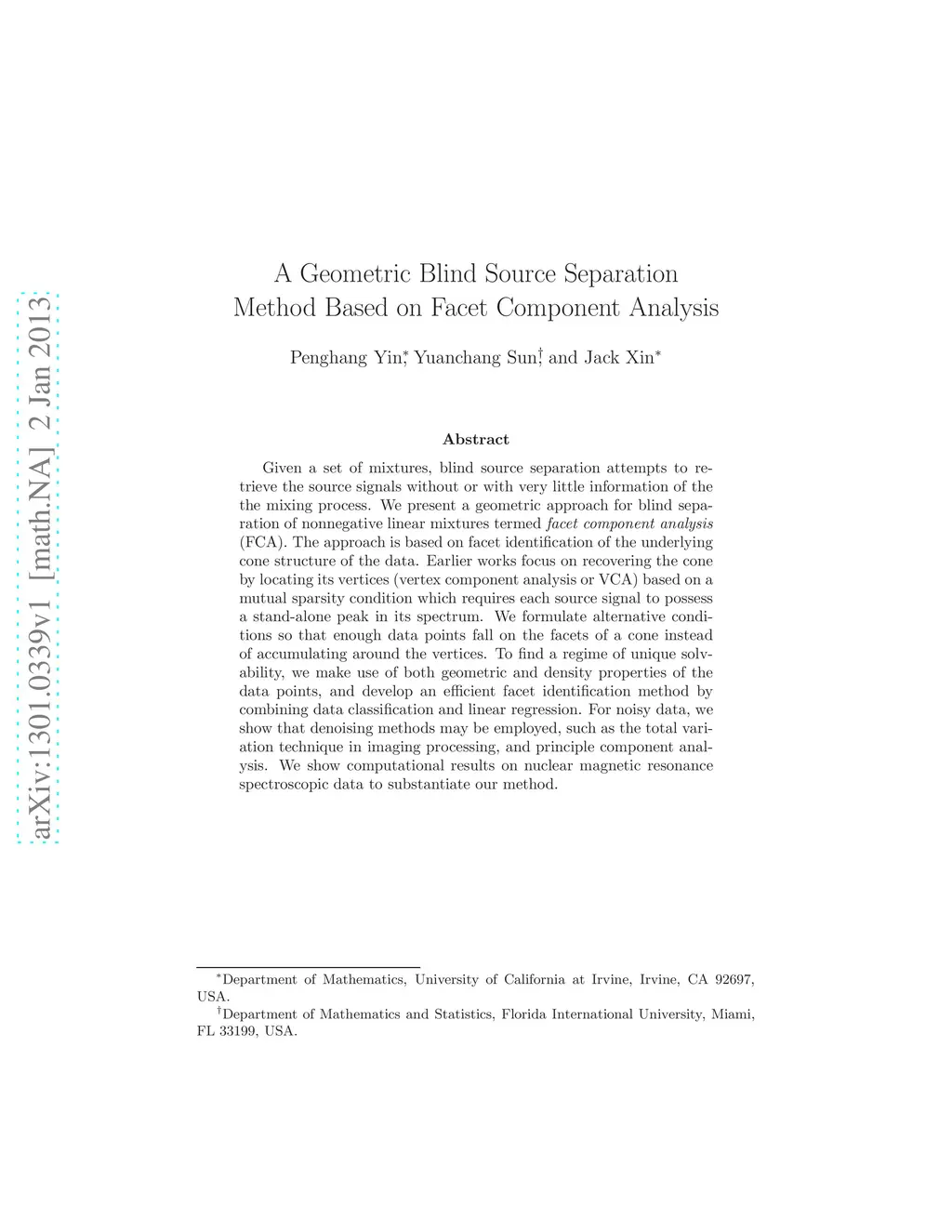 A Geometric Blind Source Separation Method Based on Facet Component