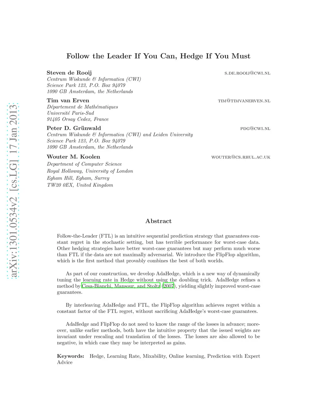 Follow-the-Leader (FTL) is an intuitive sequential prediction strategy that guarantees constant regret in the stochastic setting, but has terrible performance for worst-case data. Other hedging strategies have better worst-case guarantees but may perform much worse than FTL if the data are not maximally adversarial. We introduce the FlipFlop algorithm, which is the first method that provably combines the best of both worlds. As part of our construction, we develop AdaHedge, which is a new way of dynamically tuning the learning rate in Hedge without using the doubling trick. AdaHedge refines a method by Cesa-Bianchi, Mansour and Stoltz (2007), yielding slightly improved worst-case guarantees. By interleaving AdaHedge and FTL, the FlipFlop algorithm achieves regret within a constant factor of the FTL regret, without sacrificing AdaHedge's worst-case guarantees. AdaHedge and FlipFlop do not need to know the range of the losses in advance; moreover, unlike earlier methods, both have the intuitive property that the issued weights are invariant under rescaling and translation of the losses. The losses are also allowed to be negative, in which case they may be interpreted as gains.