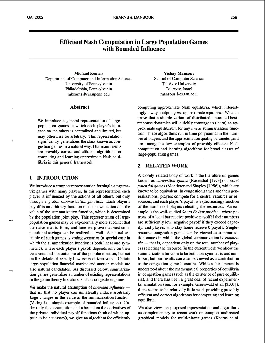 We introduce a general representation of large-population games in which each player s influence ON the others IS centralized AND limited, but may otherwise be arbitrary.This representation significantly generalizes the class known AS congestion games IN a natural way.Our main results are provably correct AND efficient algorithms FOR computing AND learning approximate Nash equilibria IN this general framework.