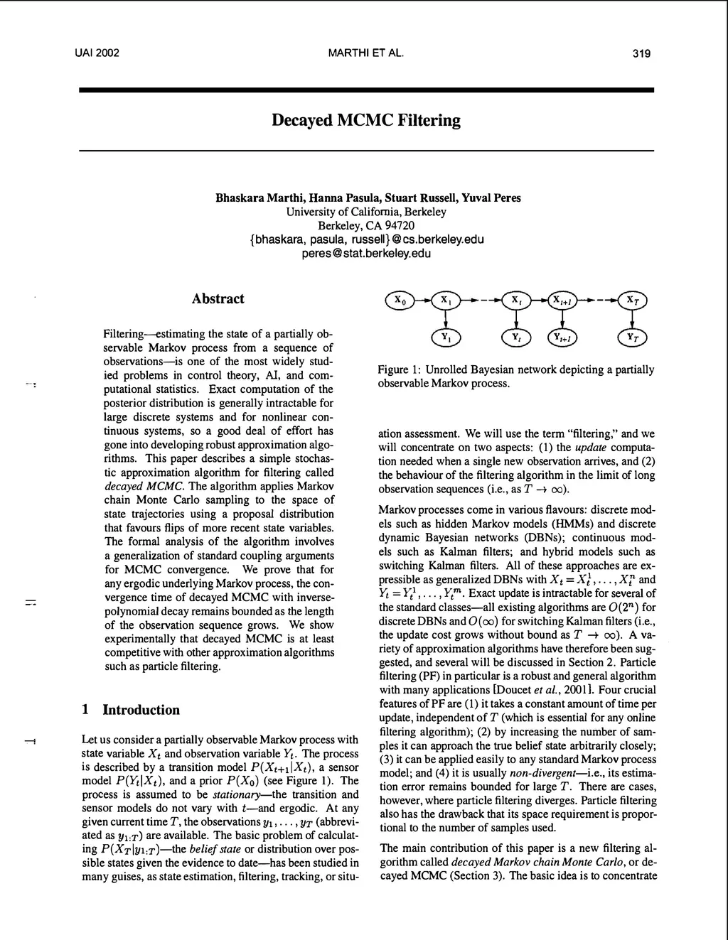 Filtering---estimating the state of a partially observable Markov process from a sequence of observations---is one of the most widely studied problems in control theory, AI, and computational statistics. Exact computation of the posterior distribution is generally intractable for large discrete systems and for nonlinear continuous systems, so a good deal of effort has gone into developing robust approximation algorithms. This paper describes a simple stochastic approximation algorithm for filtering called {em decayed MCMC}. The algorithm applies Markov chain Monte Carlo sampling to the space of state trajectories using a proposal distribution that favours flips of more recent state variables. The formal analysis of the algorithm involves a generalization of standard coupling arguments for MCMC convergence. We prove that for any ergodic underlying Markov process, the convergence time of decayed MCMC with inverse-polynomial decay remains bounded as the length of the observation sequence grows. We show experimentally that decayed MCMC is at least competitive with other approximation algorithms such as particle filtering.