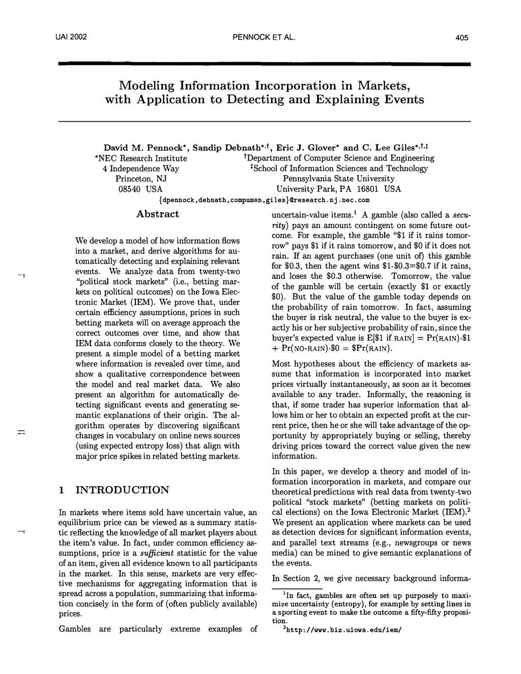 We develop a model of how information flows into a market, and derive algorithms for automatically detecting and explaining relevant events. We analyze data from twenty-two "political stock markets" (i.e., betting markets on political outcomes) on the Iowa Electronic Market (IEM). We prove that, under certain efficiency assumptions, prices in such betting markets will on average approach the correct outcomes over time, and show that IEM data conforms closely to the theory. We present a simple model of a betting market where information is revealed over time, and show a qualitative correspondence between the model and real market data. We also present an algorithm for automatically detecting significant events and generating semantic explanations of their origin. The algorithm operates by discovering significant changes in vocabulary on online news sources (using expected entropy loss) that align with major price spikes in related betting markets.