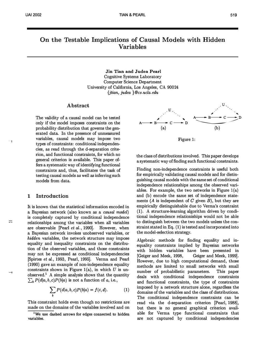 The validity OF a causal model can be tested ONLY IF the model imposes constraints ON the probability distribution that governs the generated data. IN the presence OF unmeasured variables, causal models may impose two types OF constraints : conditional independencies, AS READ through the d - separation criterion, AND functional constraints, FOR which no general criterion IS available.This paper offers a systematic way OF identifying functional constraints AND, thus, facilitates the task OF testing causal models AS well AS inferring such models FROM data.