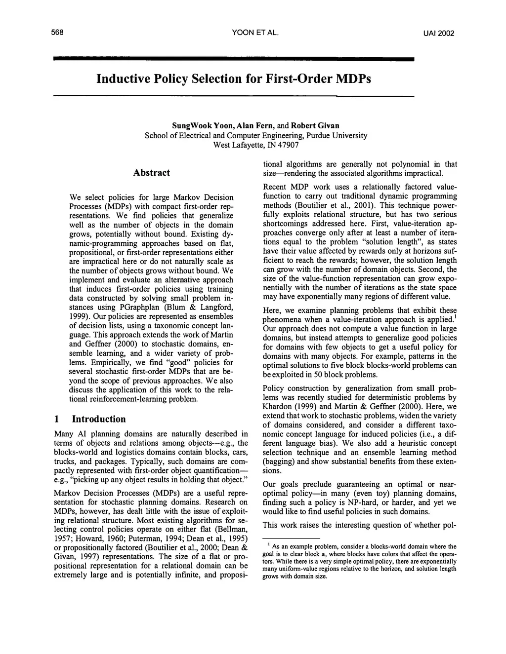 We select policies for large Markov Decision Processes (MDPs) with compact first-order representations. We find policies that generalize well as the number of objects in the domain grows, potentially without bound. Existing dynamic-programming approaches based on flat, propositional, or first-order representations either are impractical here or do not naturally scale as the number of objects grows without bound. We implement and evaluate an alternative approach that induces first-order policies using training data constructed by solving small problem instances using PGraphplan (Blum & Langford, 1999). Our policies are represented as ensembles of decision lists, using a taxonomic concept language. This approach extends the work of Martin and Geffner (2000) to stochastic domains, ensemble learning, and a wider variety of problems. Empirically, we find "good" policies for several stochastic first-order MDPs that are beyond the scope of previous approaches. We also discuss the application of this work to the relational reinforcement-learning problem.