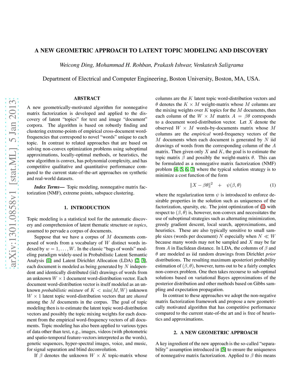 A New Geometric Approach to Latent Topic Modeling and Discovery