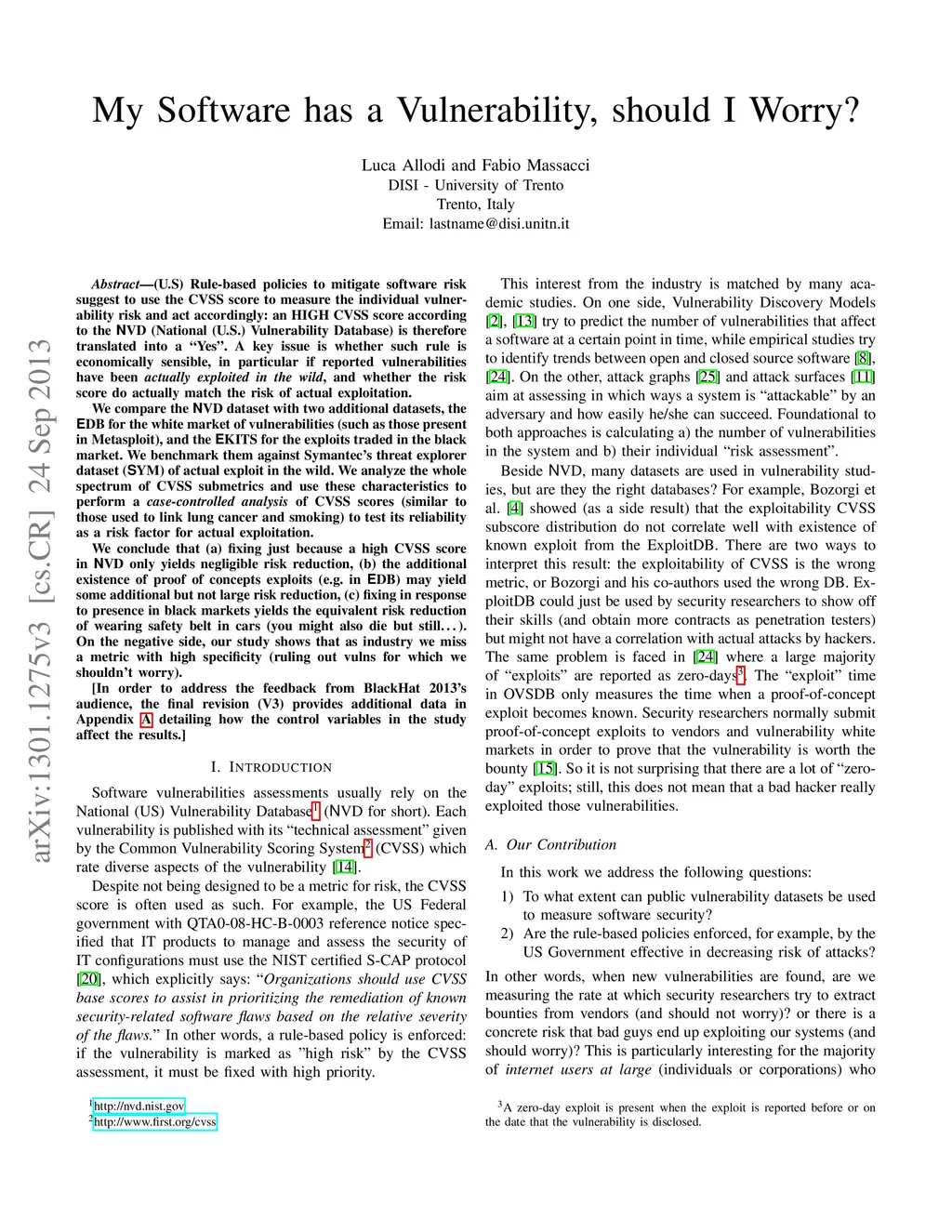 (U.S) Rule-based policies to mitigate software risk suggest to use the CVSS score to measure the individual vulnerability risk and act accordingly: an HIGH CVSS score according to the NVD (National (U.S.) Vulnerability Database) is therefore translated into a "Yes". A key issue is whether such rule is economically sensible, in particular if reported vulnerabilities have been actually exploited in the wild, and whether the risk score do actually match the risk of actual exploitation. We compare the NVD dataset with two additional datasets, the EDB for the white market of vulnerabilities (such as those present in Metasploit), and the EKITS for the exploits traded in the black market. We benchmark them against Symantec's threat explorer dataset (SYM) of actual exploit in the wild. We analyze the whole spectrum of CVSS submetrics and use these characteristics to perform a case-controlled analysis of CVSS scores (similar to those used to link lung cancer and smoking) to test its reliability as a risk factor for actual exploitation. We conclude that (a) fixing just because a high CVSS score in NVD only yields negligible risk reduction, (b) the additional existence of proof of concepts exploits (e.g. in EDB) may yield some additional but not large risk reduction, (c) fixing in response to presence in black markets yields the equivalent risk reduction of wearing safety belt in cars (you might also die but still..). On the negative side, our study shows that as industry we miss a metric with high specificity (ruling out vulns for which we shouldn't worry). In order to address the feedback from BlackHat 2013's audience, the final revision (V3) provides additional data in Appendix A detailing how the control variables in the study affect the results.