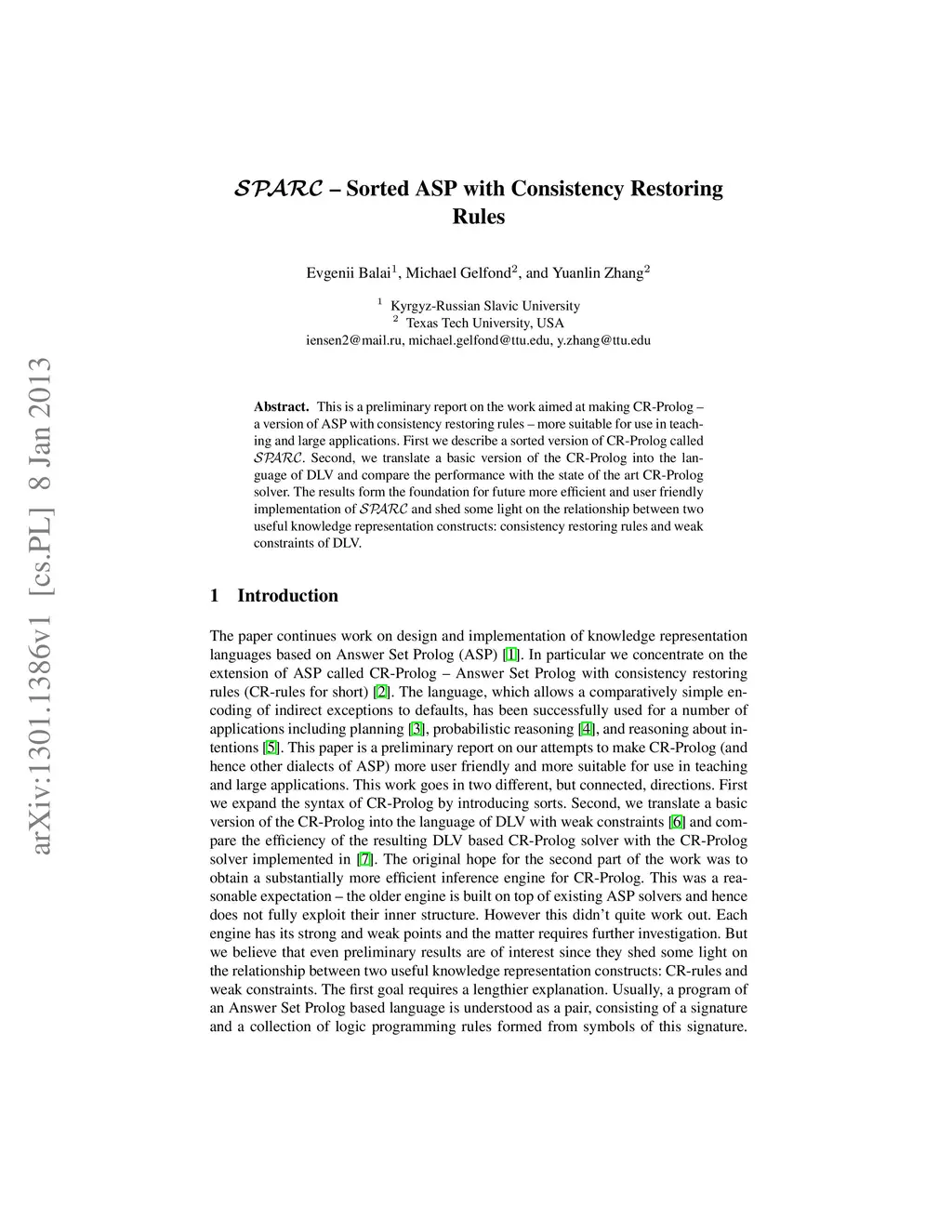 This is a preliminary report on the work aimed at making CR-Prolog -- a version of ASP with consistency restoring rules -- more suitable for use in teaching and large applications. First we describe a sorted version of CR-Prolog called SPARC. Second, we translate a basic version of the CR-Prolog into the language of DLV and compare the performance with the state of the art CR-Prolog solver. The results form the foundation for future more efficient and user friendly implementation of SPARC and shed some light on the relationship between two useful knowledge representation constructs: consistency restoring rules and weak constraints of DLV.