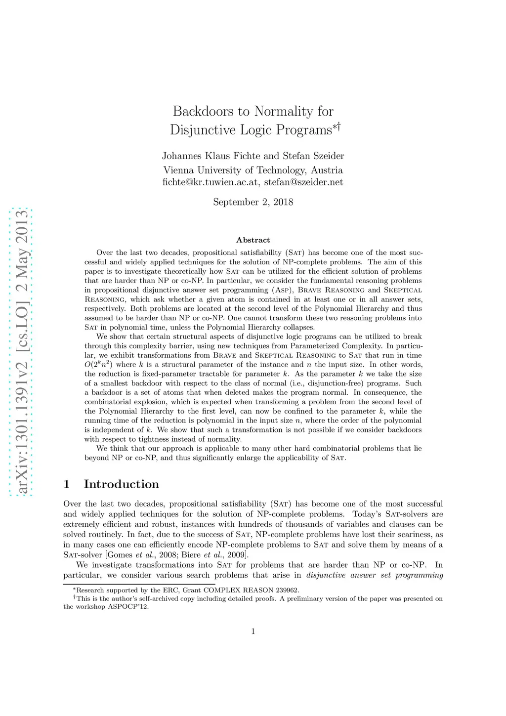 Over the last two decades, propositional satisfiability (SAT) has become one of the most successful and widely applied techniques for the solution of NP-complete problems. The aim of this paper is to investigate theoretically how Sat can be utilized for the efficient solution of problems that are harder than NP or co-NP. In particular, we consider the fundamental reasoning problems in propositional disjunctive answer set programming (ASP), Brave Reasoning and Skeptical Reasoning, which ask whether a given atom is contained in at least one or in all answer sets, respectively. Both problems are located at the second level of the Polynomial Hierarchy and thus assumed to be harder than NP or co-NP. One cannot transform these two reasoning problems into SAT in polynomial time, unless the Polynomial Hierarchy collapses. We show that certain structural aspects of disjunctive logic programs can be utilized to break through this complexity barrier, using new techniques from Parameterized Complexity. In particular, we exhibit transformations from Brave and Skeptical Reasoning to SAT that run in time O(2^k n^2) where k is a structural parameter of the instance and n the input size. In other words, the reduction is fixed-parameter tractable for parameter k. As the parameter k we take the size of a smallest backdoor with respect to the class of normal (i.e., disjunction-free) programs. Such a backdoor is a set of atoms that when deleted makes the program normal. In consequence, the combinatorial explosion, which is expected when transforming a problem from the second level of the Polynomial Hierarchy to the first level, can now be confined to the parameter k, while the running time of the reduction is polynomial in the input size n, where the order of the polynomial is independent of k.