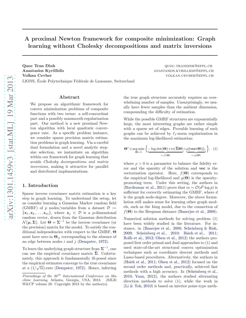 We propose an algorithmic framework for convex minimization problems of a composite function with two terms: a self-concordant function and a possibly nonsmooth regularization term. Our method is a new proximal Newton algorithm that features a local quadratic convergence rate. As a specific instance of our framework, we consider the sparse inverse covariance matrix estimation in graph learning problems. Via a careful dual formulation and a novel analytic step-size selection procedure, our approach for graph learning avoids Cholesky decompositions and matrix inversions in its iteration making it attractive for parallel and distributed implementations.