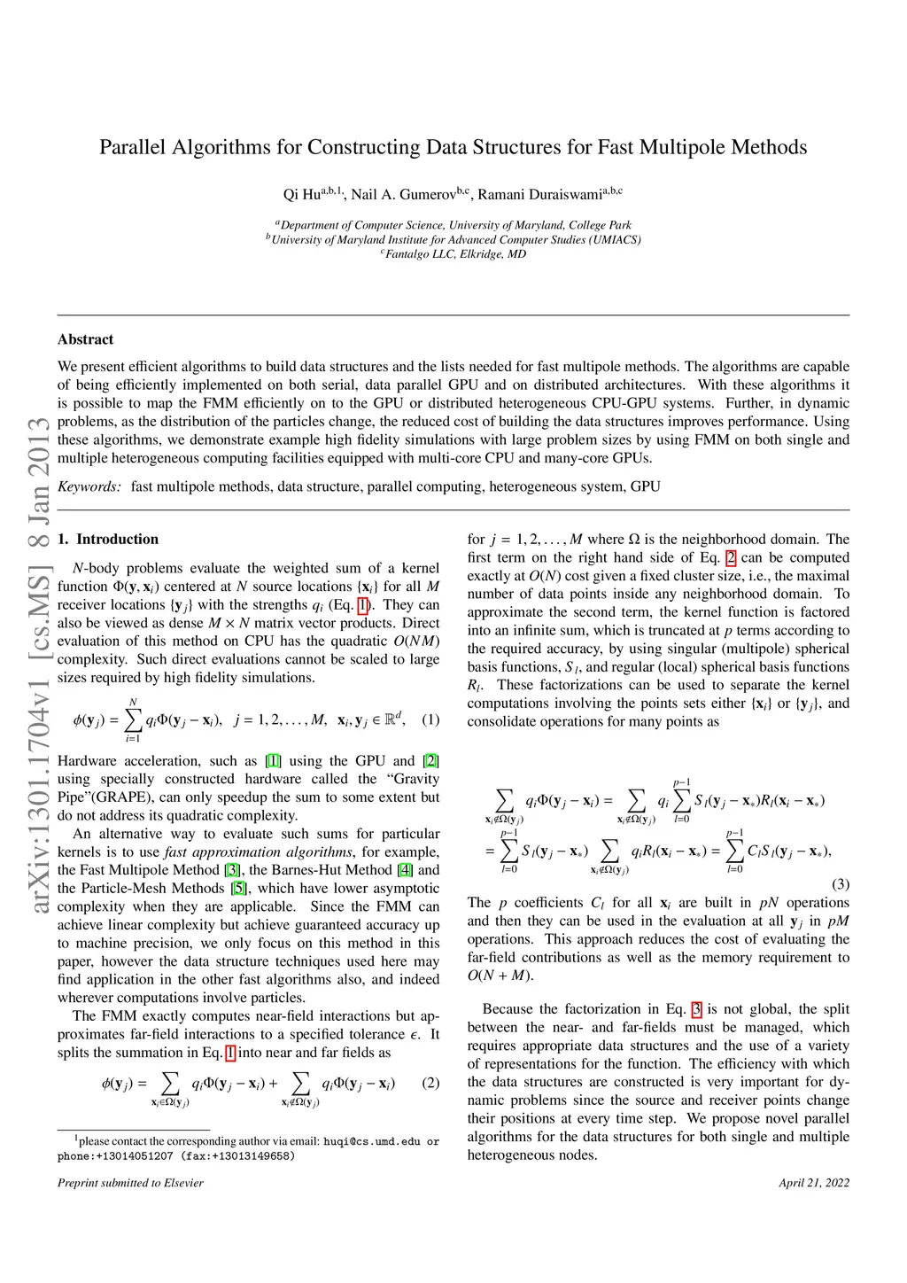 We present efficient algorithms to build data structures and the lists needed for fast multipole methods. The algorithms are capable of being efficiently implemented on both serial, data parallel GPU and on distributed architectures. With these algorithms it is possible to map the FMM efficiently on to the GPU or distributed heterogeneous CPU-GPU systems. Further, in dynamic problems, as the distribution of the particles change, the reduced cost of building the data structures improves performance. Using these algorithms, we demonstrate example high fidelity simulations with large problem sizes by using FMM on both single and multiple heterogeneous computing facilities equipped with multi-core CPU and many-core GPUs.