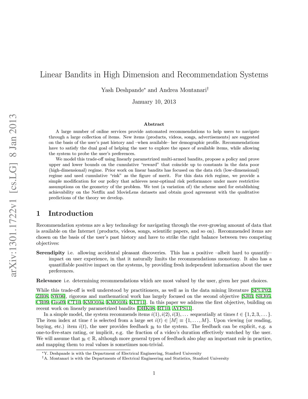A large number of online services provide automated recommendations to help users to navigate through a large collection of items. New items (products, videos, songs, advertisements) are suggested on the basis of the user's past history and --when available-- her demographic profile. Recommendations have to satisfy the dual goal of helping the user to explore the space of available items, while allowing the system to probe the user's preferences. We model this trade-off using linearly parametrized multi-armed bandits, propose a policy and prove upper and lower bounds on the cumulative "reward" that coincide up to constants in the data poor (high-dimensional) regime. Prior work on linear bandits has focused on the data rich (low-dimensional) regime and used cumulative "risk" as the figure of merit. For this data rich regime, we provide a simple modification for our policy that achieves near-optimal risk performance under more restrictive assumptions on the geometry of the problem. We test (a variation of) the scheme used for establishing achievability on the Netflix and MovieLens datasets and obtain good agreement with the qualitative predictions of the theory we develop.