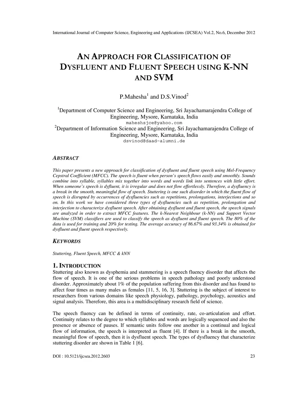 An Approach for Classification of Dysfluent and Fluent Speech Using K-NN
