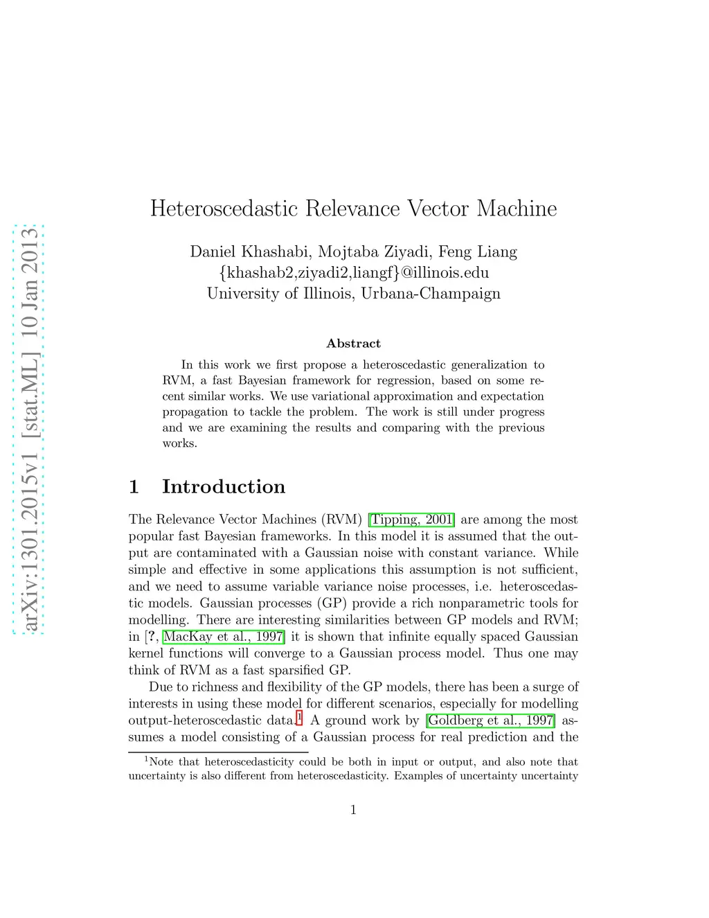 In this work we propose a heteroscedastic generalization to RVM, a fast Bayesian framework for regression, based on some recent similar works. We use variational approximation and expectation propagation to tackle the problem. The work is still under progress and we are examining the results and comparing with the previous works.
