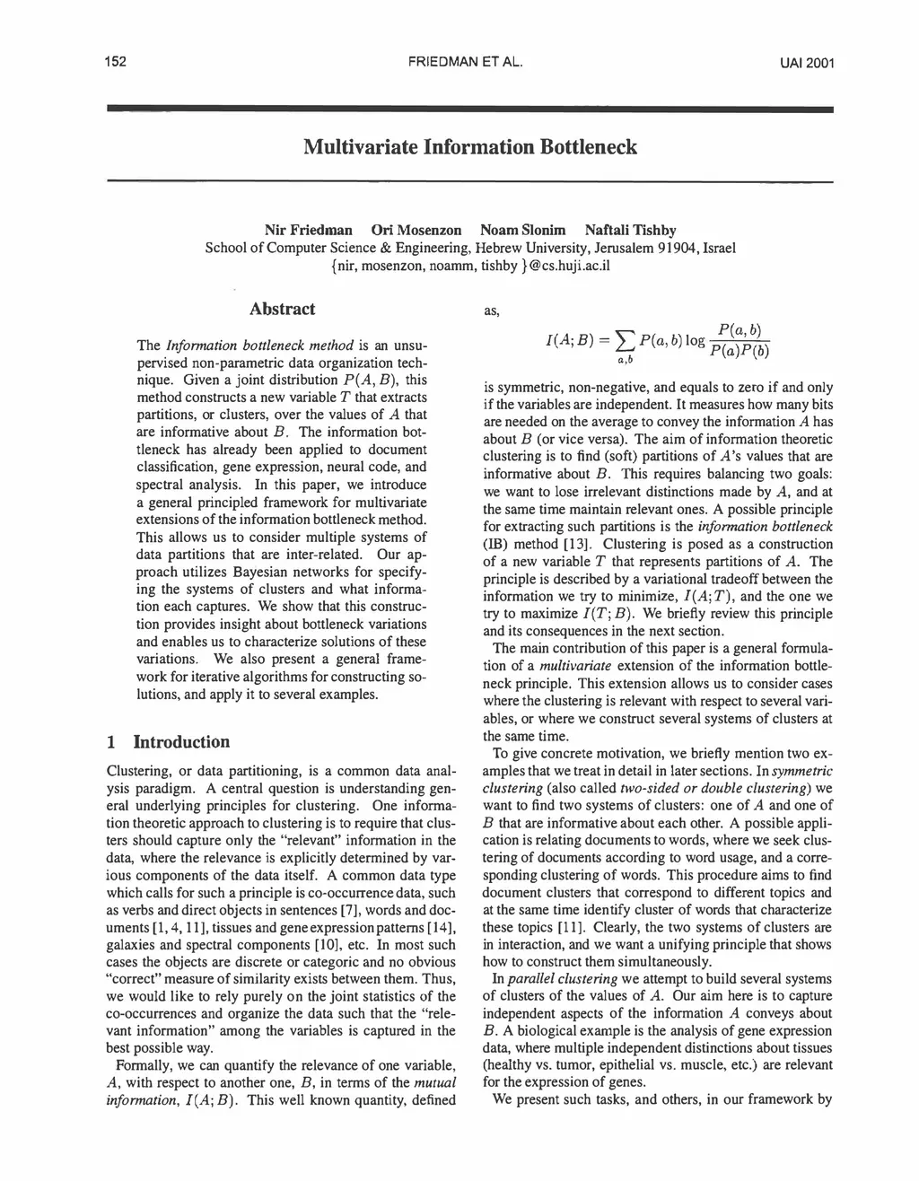 The Information bottleneck method is an unsupervised non-parametric data organization technique. Given a joint distribution P(A,B), this method constructs a new variable T that extracts partitions, or clusters, over the values of A that are informative about B. The information bottleneck has already been applied to document classification, gene expression, neural code, and spectral analysis. In this paper, we introduce a general principled framework for multivariate extensions of the information bottleneck method. This allows us to consider multiple systems of data partitions that are inter-related. Our approach utilizes Bayesian networks for specifying the systems of clusters and what information each captures. We show that this construction provides insight about bottleneck variations and enables us to characterize solutions of these variations. We also present a general framework for iterative algorithms for constructing solutions, and apply it to several examples.