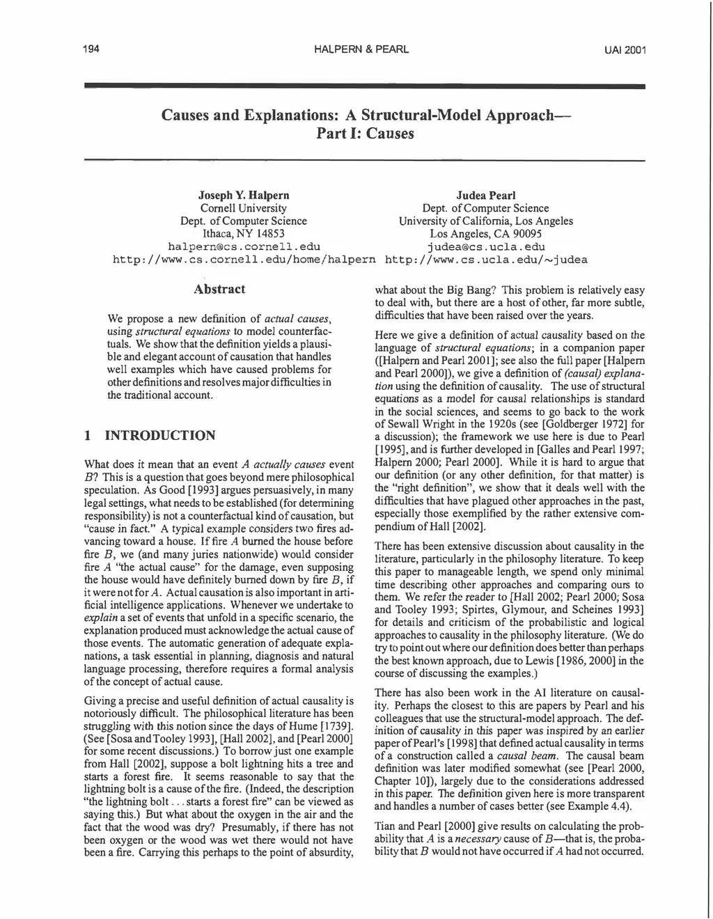 We propose a new definition of actual causes, using structural equations to model counterfactuals.We show that the definitions yield a plausible and elegant account ofcausation that handles well examples which have caused problems forother definitions and resolves major difficulties in the traditionalaccount. In a companion paper, we show how the definition of causality can beused to give an elegant definition of (causal) explanation.