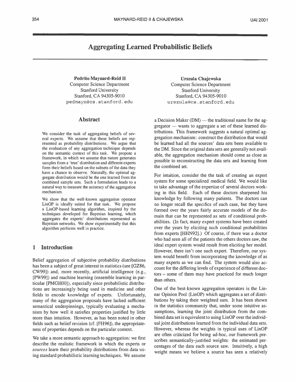 We consider the task of aggregating beliefs of severalexperts. We assume that these beliefs are represented as probabilitydistributions. We argue that the evaluation of any aggregationtechnique depends on the semantic context of this task. We propose aframework, in which we assume that nature generates samples from a`true' distribution and different experts form their beliefs based onthe subsets of the data they have a chance to observe. Naturally, theideal aggregate distribution would be the one learned from thecombined sample sets. Such a formulation leads to a natural way tomeasure the accuracy of the aggregation mechanism.We show that the well-known aggregation operator LinOP is ideallysuited for that task. We propose a LinOP-based learning algorithm,inspired by the techniques developed for Bayesian learning, whichaggregates the experts' distributions represented as Bayesiannetworks. Our preliminary experiments show that this algorithmperforms well in practice.