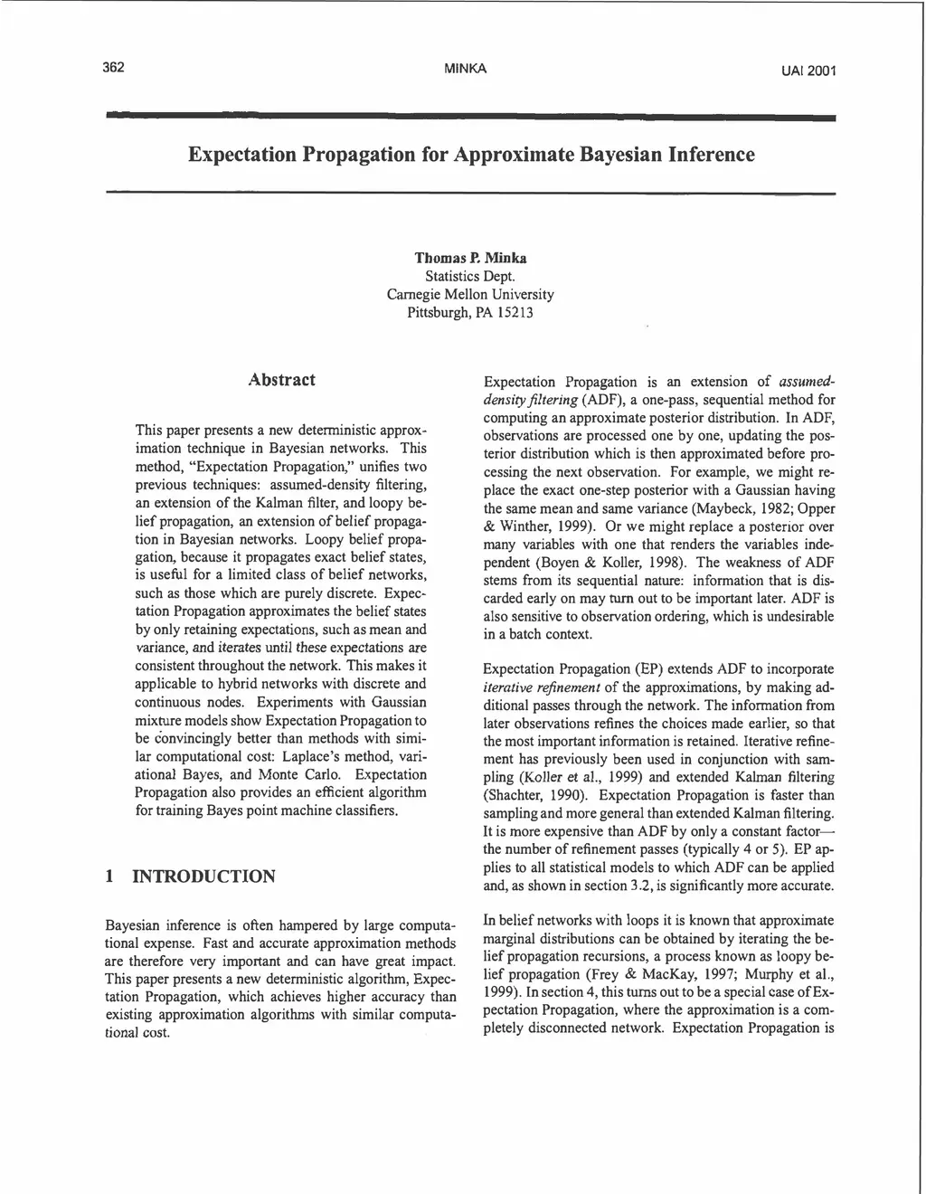 This paper presents a new deterministic approximation technique in Bayesian networks. This method, "Expectation Propagation", unifies two previous techniques: assumed-density filtering, an extension of the Kalman filter, and loopy belief propagation, an extension of belief propagation in Bayesian networks. All three algorithms try to recover an approximate distribution which is close in KL divergence to the true distribution. Loopy belief propagation, because it propagates exact belief states, is useful for a limited class of belief networks, such as those which are purely discrete. Expectation Propagation approximates the belief states by only retaining certain expectations, such as mean and variance, and iterates until these expectations are consistent throughout the network. This makes it applicable to hybrid networks with discrete and continuous nodes. Expectation Propagation also extends belief propagation in the opposite direction - it can propagate richer belief states that incorporate correlations between nodes. Experiments with Gaussian mixture models show Expectation Propagation to be convincingly better than methods with similar computational cost: Laplace's method, variational Bayes, and Monte Carlo. Expectation Propagation also provides an efficient algorithm for training Bayes point machine classifiers.