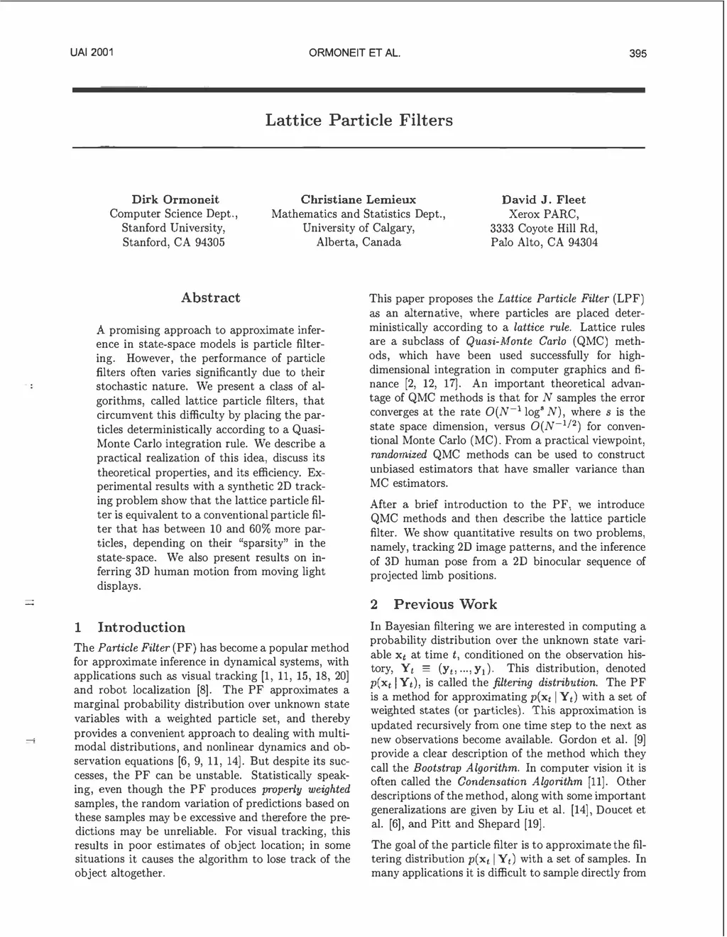 A standard approach to approximate inference in state-space models isto apply a particle filter, e.g., the Condensation Algorithm.However, the performance of particle filters often varies significantlydue to their stochastic nature.We present a class of algorithms, called lattice particle filters, thatcircumvent this difficulty by placing the particles deterministicallyaccording to a Quasi-Monte Carlo integration rule.We describe a practical realization of this idea, discuss itstheoretical properties, and its efficiency.Experimental results with a synthetic 2D tracking problem show that thelattice particle filter is equivalent to a conventional particle filterthat has between 10 and 60% more particles, depending ontheir "sparsity" in the state-space.We also present results on inferring 3D human motion frommoving light displays.