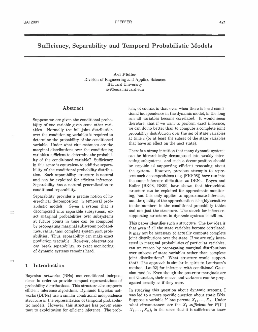 Suppose we are given the conditional probability of one variable given some other variables.Normally the full joint distribution over the conditioning variablesis required to determine the probability of the conditioned variable.Under what circumstances are the marginal distributions over the conditioning variables sufficient to determine the probability ofthe conditioned variable?Sufficiency in this sense is equivalent to additive separability ofthe conditional probability distribution.Such separability structure is natural and can be exploited forefficient inference.Separability has a natural generalization to conditional separability.Separability provides a precise notion of weaklyinteracting subsystems in temporal probabilistic models.Given a system that is decomposed into separable subsystems, exactmarginal probabilities over subsystems at future points in time can becomputed by propagating marginal subsystem probabilities, rather thancomplete system joint probabilities.Thus, separability can make exact prediction tractable.However, observations can break separability,so exact monitoring of dynamic systems remains hard.