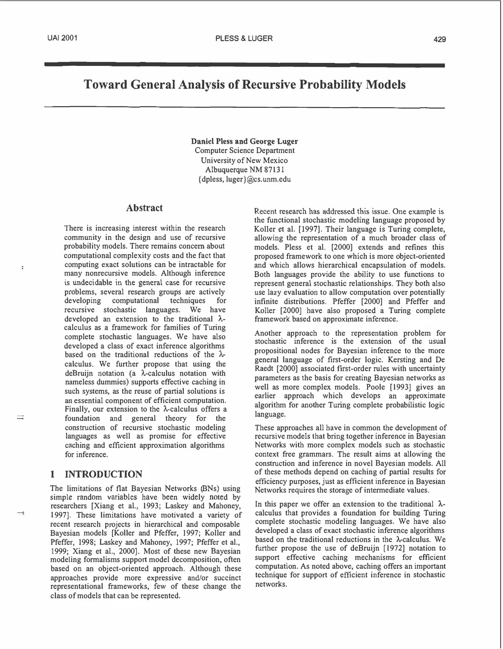 There is increasing interest within the research community in the design and use of recursive probability models. Although there still remains concern about computational complexity costs and the fact that computing exact solutions can be intractable for many nonrecursive models and impossible in the general case for recursive problems, several research groups are actively developing computational techniques for recursive stochastic languages. We have developed an extension to the traditional lambda-calculus as a framework for families of Turing complete stochastic languages. We have also developed a class of exact inference algorithms based on the traditional reductions of the lambda-calculus. We further propose that using the deBruijn notation (a lambda-calculus notation with nameless dummies) supports effective caching in such systems (caching being an essential component of efficient computation). Finally, our extension to the lambda-calculus offers a foundation and general theory for the construction of recursive stochastic modeling languages as well as promise for effective caching and efficient approximation algorithms for inference.