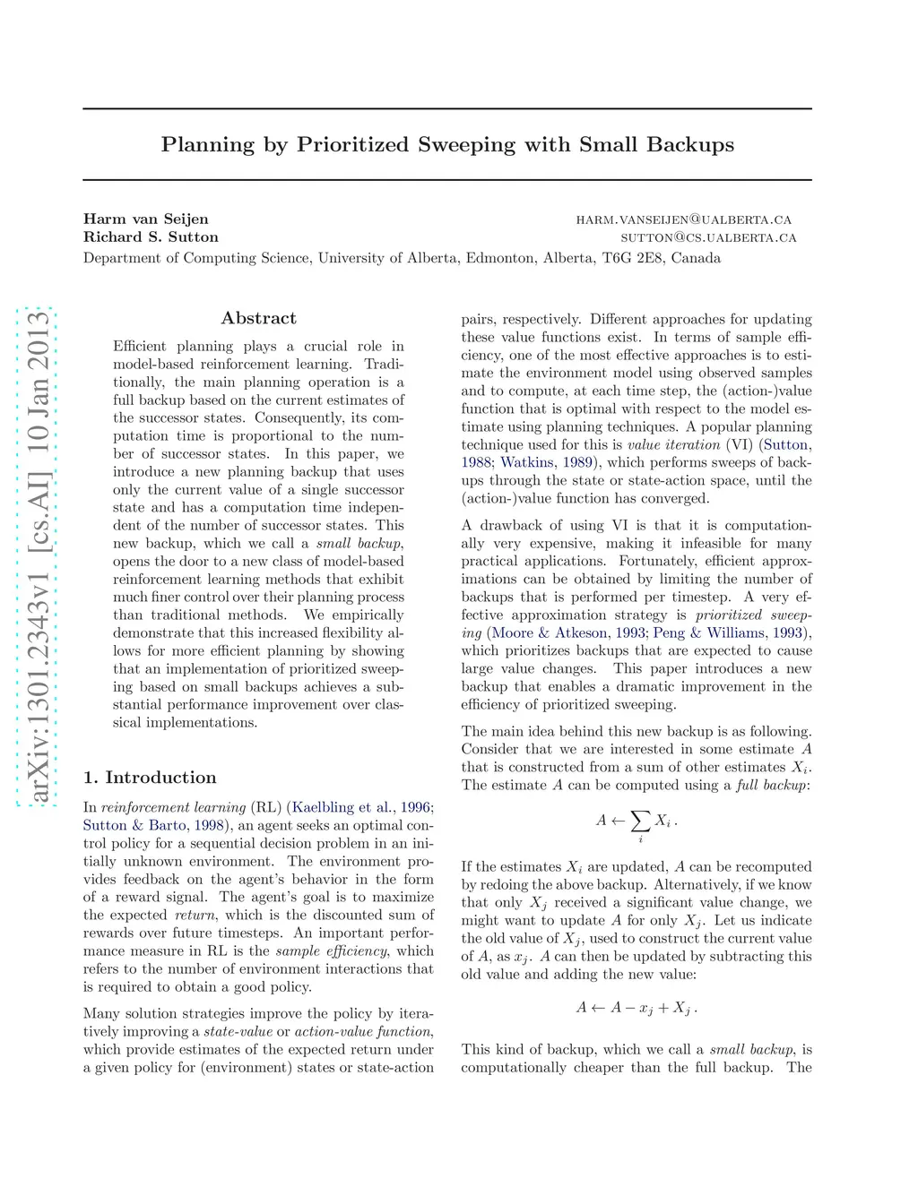 Efficient planning plays a crucial role in model-based reinforcement learning. Traditionally, the main planning operation is a full backup based on the current estimates of the successor states. Consequently, its computation time is proportional to the number of successor states. In this paper, we introduce a new planning backup that uses only the current value of a single successor state and has a computation time independent of the number of successor states. This new backup, which we call a small backup, opens the door to a new class of model-based reinforcement learning methods that exhibit much finer control over their planning process than traditional methods. We empirically demonstrate that this increased flexibility allows for more efficient planning by showing that an implementation of prioritized sweeping based on small backups achieves a substantial performance improvement over classical implementations.