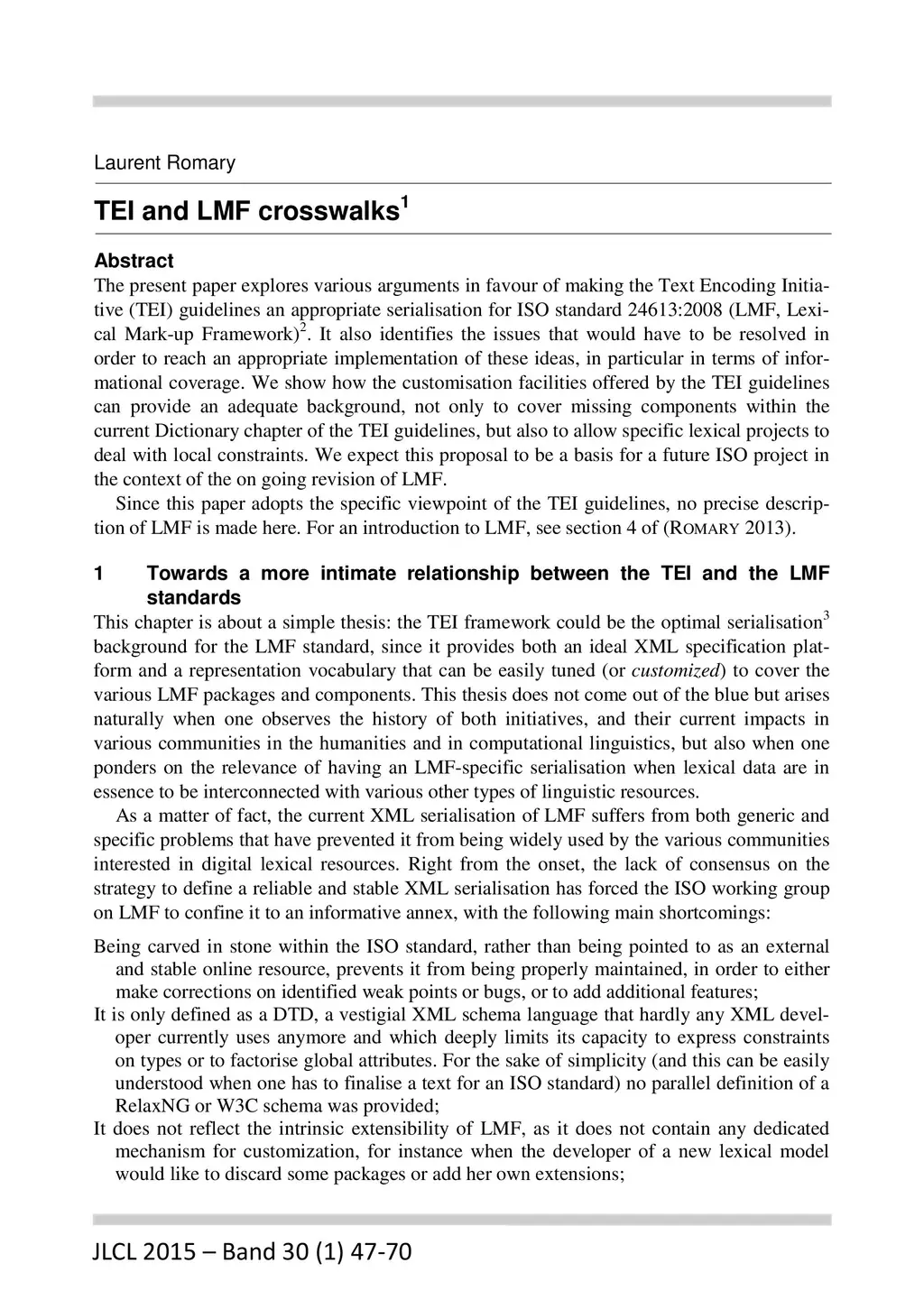 The present paper explores various arguments in favour of making the Text Encoding Initia-tive (TEI) guidelines an appropriate serialisation for ISO standard 24613:2008 (LMF, Lexi-cal Mark-up Framework) . It also identifies the issues that would have to be resolved in order to reach an appropriate implementation of these ideas, in particular in terms of infor-mational coverage. We show how the customisation facilities offered by the TEI guidelines can provide an adequate background, not only to cover missing components within the current Dictionary chapter of the TEI guidelines, but also to allow specific lexical projects to deal with local constraints. We expect this proposal to be a basis for a future ISO project in the context of the on going revision of LMF.
