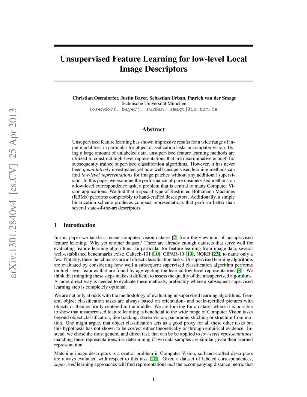 Unsupervised Feature Learning for low-level Local Image Descriptors