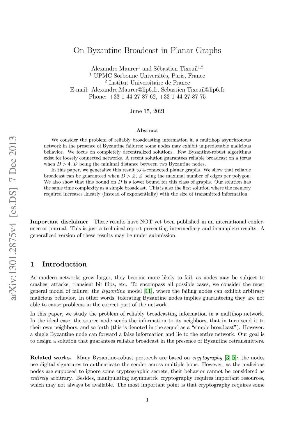 We consider the problem of reliably broadcasting information in a multihop asynchronous network in the presence of Byzantine failures: some nodes may exhibit unpredictable malicious behavior. We focus on completely decentralized solutions. Few Byzantine-robust algorithms exist for loosely connected networks. A recent solution guarantees reliable broadcast on a torus when D > 4, D being the minimal distance between two Byzantine nodes. In this paper, we generalize this result to 4-connected planar graphs. We show that reliable broadcast can be guaranteed when D > Z, Z being the maximal number of edges per polygon. We also show that this bound on D is a lower bound for this class of graphs. Our solution has the same time complexity as a simple broadcast. This is also the first solution where the memory required increases linearly (instead of exponentially) with the size of transmitted information. Important disclaimer: these results have NOT yet been published in an international conference or journal. This is just a technical report presenting intermediary and incomplete results. A generalized version of these results may be under submission.
