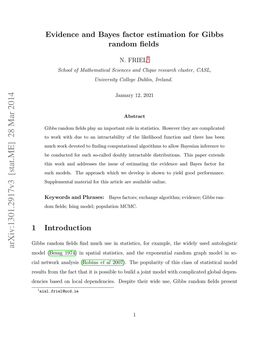 Gibbs random fields play an important role in statistics. However they are complicated to work with due to an intractability of the likelihood function and there has been much work devoted to finding computational algorithms to allow Bayesian inference to be conducted for such so-called doubly intractable distributions. This paper extends this work and addresses the issue of estimating the evidence and Bayes factor for such models. The approach which we develop is shown to yield good performance.