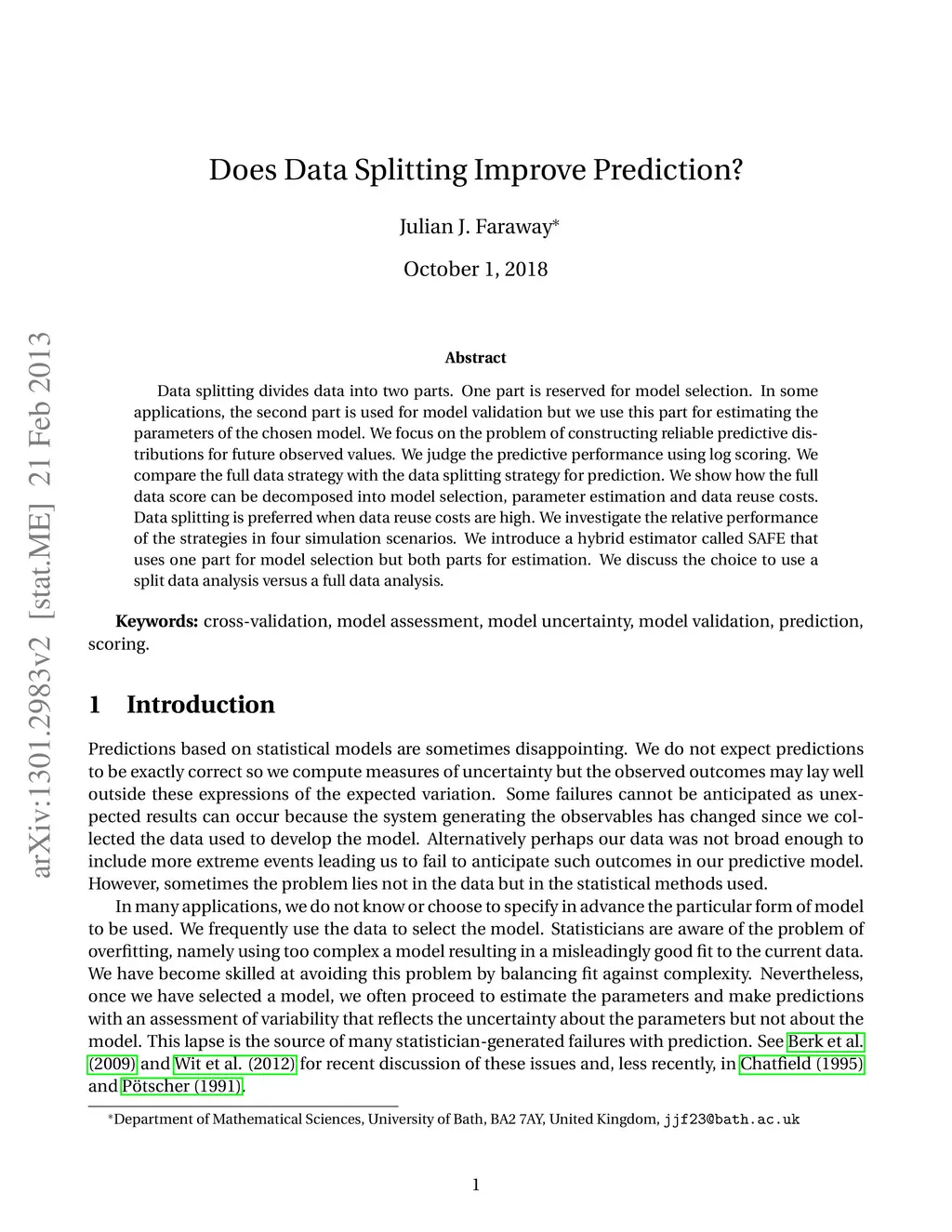 Data splitting divides data into two parts. One part is reserved for model selection. In some applications, the second part is used for model validation but we use this part for estimating the parameters of the chosen model. We focus on the problem of constructing reliable predictive distributions for future observed values. We judge the predictive performance using log scoring. We compare the full data strategy with the data splitting strategy for prediction. We show how the full data score can be decomposed into model selection, parameter estimation and data reuse costs. Data splitting is preferred when data reuse costs are high. We investigate the relative performance of the strategies in four simulation scenarios. We introduce a hybrid estimator called SAFE that uses one part for model selection but both parts for estimation. We discuss the choice to use a split data analysis versus a full data analysis.