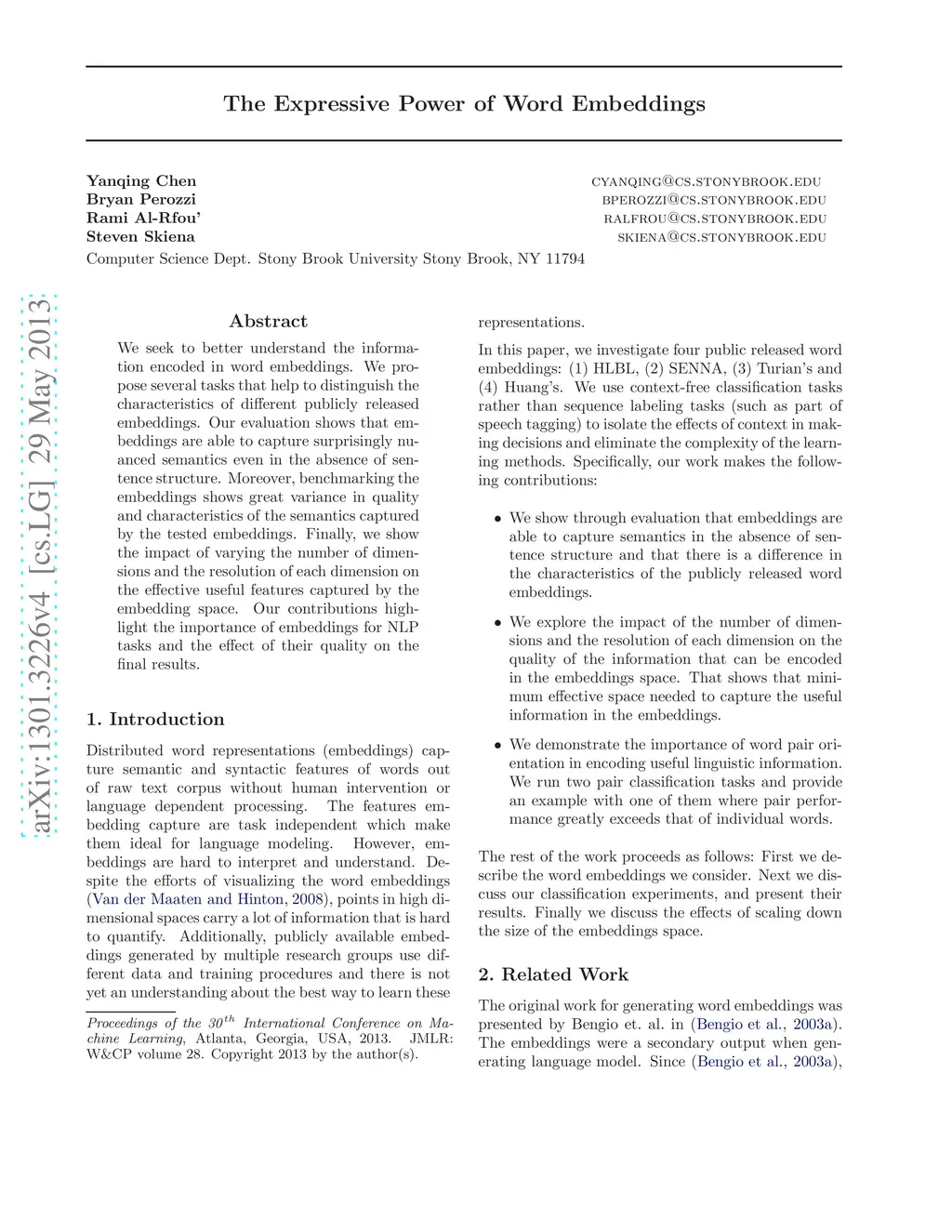We seek to better understand the difference in quality of the several publicly released embeddings. We propose several tasks that help to distinguish the characteristics of different embeddings. Our evaluation of sentiment polarity and synonym/antonym relations shows that embeddings are able to capture surprisingly nuanced semantics even in the absence of sentence structure. Moreover, benchmarking the embeddings shows great variance in quality and characteristics of the semantics captured by the tested embeddings. Finally, we show the impact of varying the number of dimensions and the resolution of each dimension on the effective useful features captured by the embedding space. Our contributions highlight the importance of embeddings for NLP tasks and the effect of their quality on the final results.