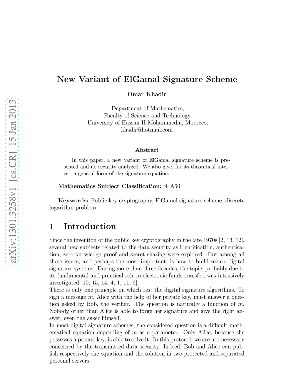In this paper, a new variant of ElGamal signature scheme is presented and its security analyzed. We also give, for its theoretical interest, a general form of the signature equation.