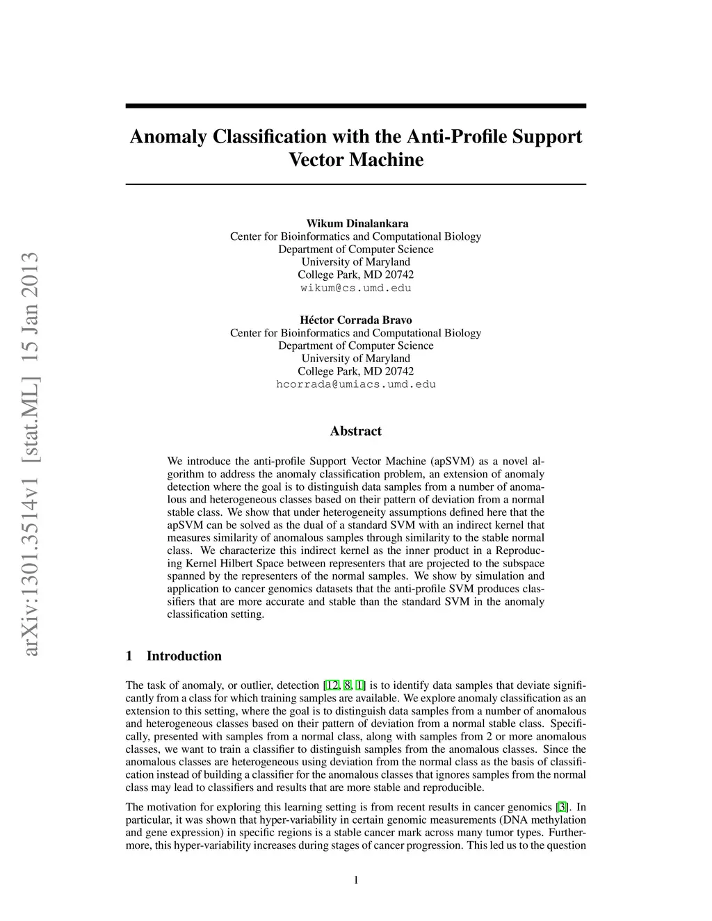 We introduce the anti-profile Support Vector Machine (apSVM) as a novel algorithm to address the anomaly classification problem, an extension of anomaly detection where the goal is to distinguish data samples from a number of anomalous and heterogeneous classes based on their pattern of deviation from a normal stable class. We show that under heterogeneity assumptions defined here that the apSVM can be solved as the dual of a standard SVM with an indirect kernel that measures similarity of anomalous samples through similarity to the stable normal class. We characterize this indirect kernel as the inner product in a Reproducing Kernel Hilbert Space between representers that are projected to the subspace spanned by the representers of the normal samples. We show by simulation and application to cancer genomics datasets that the anti-profile SVM produces classifiers that are more accurate and stable than the standard SVM in the anomaly classification setting.