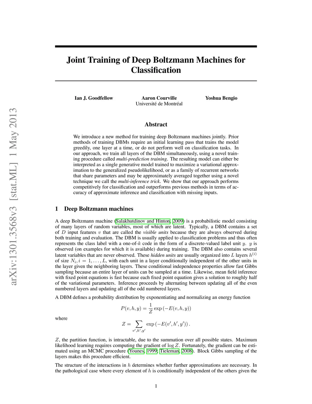 We introduce a new method for training deep Boltzmann machines jointly. Prior methods of training DBMs require an initial learning pass that trains the model greedily, one layer at a time, or do not perform well on classification tasks. In our approach, we train all layers of the DBM simultaneously, using a novel training procedure called multi-prediction training. The resulting model can either be interpreted as a single generative model trained to maximize a variational approximation to the generalized pseudolikelihood, or as a family of recurrent networks that share parameters and may be approximately averaged together using a novel technique we call the multi-inference trick. We show that our approach performs competitively for classification and outperforms previous methods in terms of accuracy of approximate inference and classification with missing inputs.