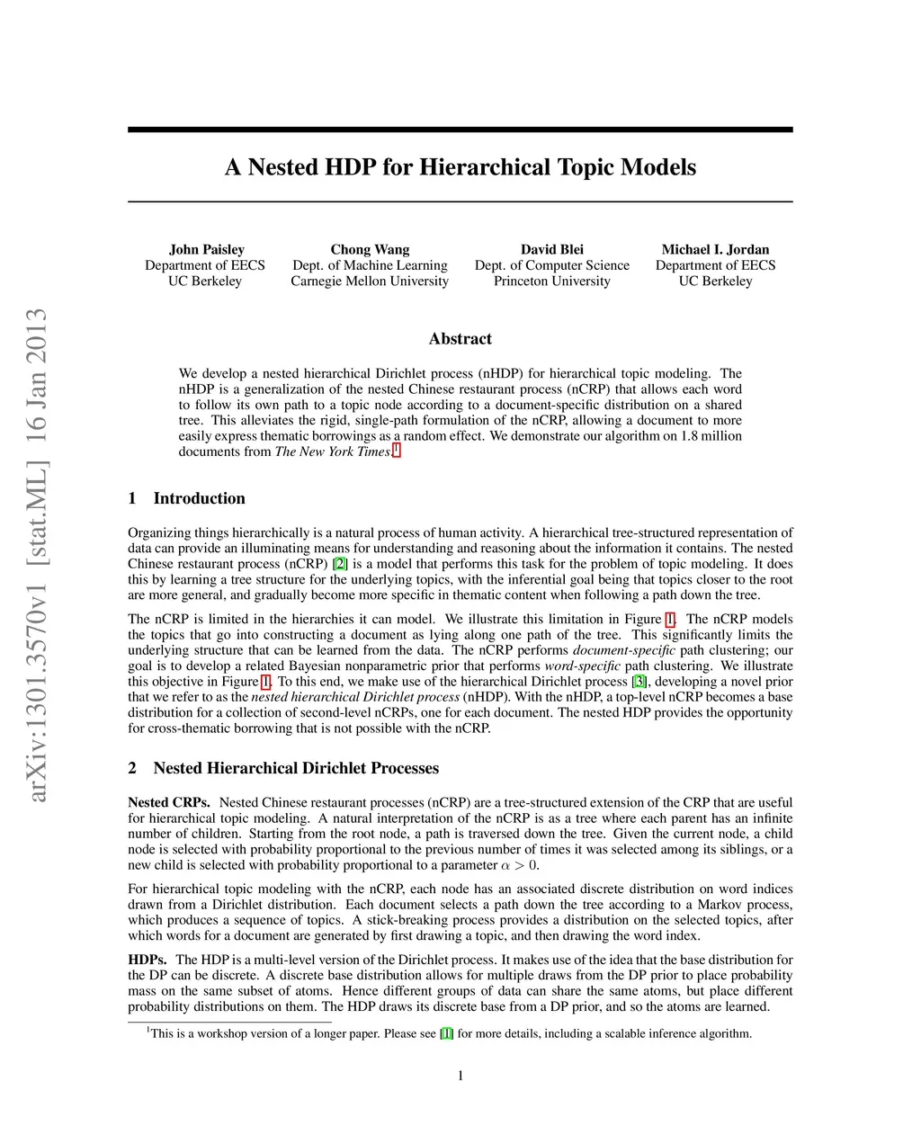 We develop a nested hierarchical Dirichlet process (nHDP) for hierarchical topic modeling. The nHDP is a generalization of the nested Chinese restaurant process (nCRP) that allows each word to follow its own path to a topic node according to a document-specific distribution on a shared tree. This alleviates the rigid, single-path formulation of the nCRP, allowing a document to more easily express thematic borrowings as a random effect. We demonstrate our algorithm on 1.8 million documents from The New York Times.