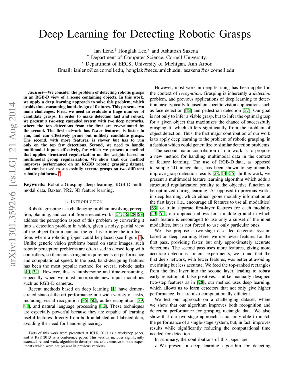 We consider the problem of detecting robotic grasps in an RGB-D view of a scene containing objects. In this work, we apply a deep learning approach to solve this problem, which avoids time-consuming hand-design of features. This presents two main challenges. First, we need to evaluate a huge number of candidate grasps. In order to make detection fast, as well as robust, we present a two-step cascaded structure with two deep networks, where the top detections from the first are re-evaluated by the second. The first network has fewer features, is faster to run, and can effectively prune out unlikely candidate grasps. The second, with more features, is slower but has to run only on the top few detections. Second, we need to handle multimodal inputs well, for which we present a method to apply structured regularization on the weights based on multimodal group regularization. We demonstrate that our method outperforms the previous state-of-the-art methods in robotic grasp detection, and can be used to successfully execute grasps on two different robotic platforms.