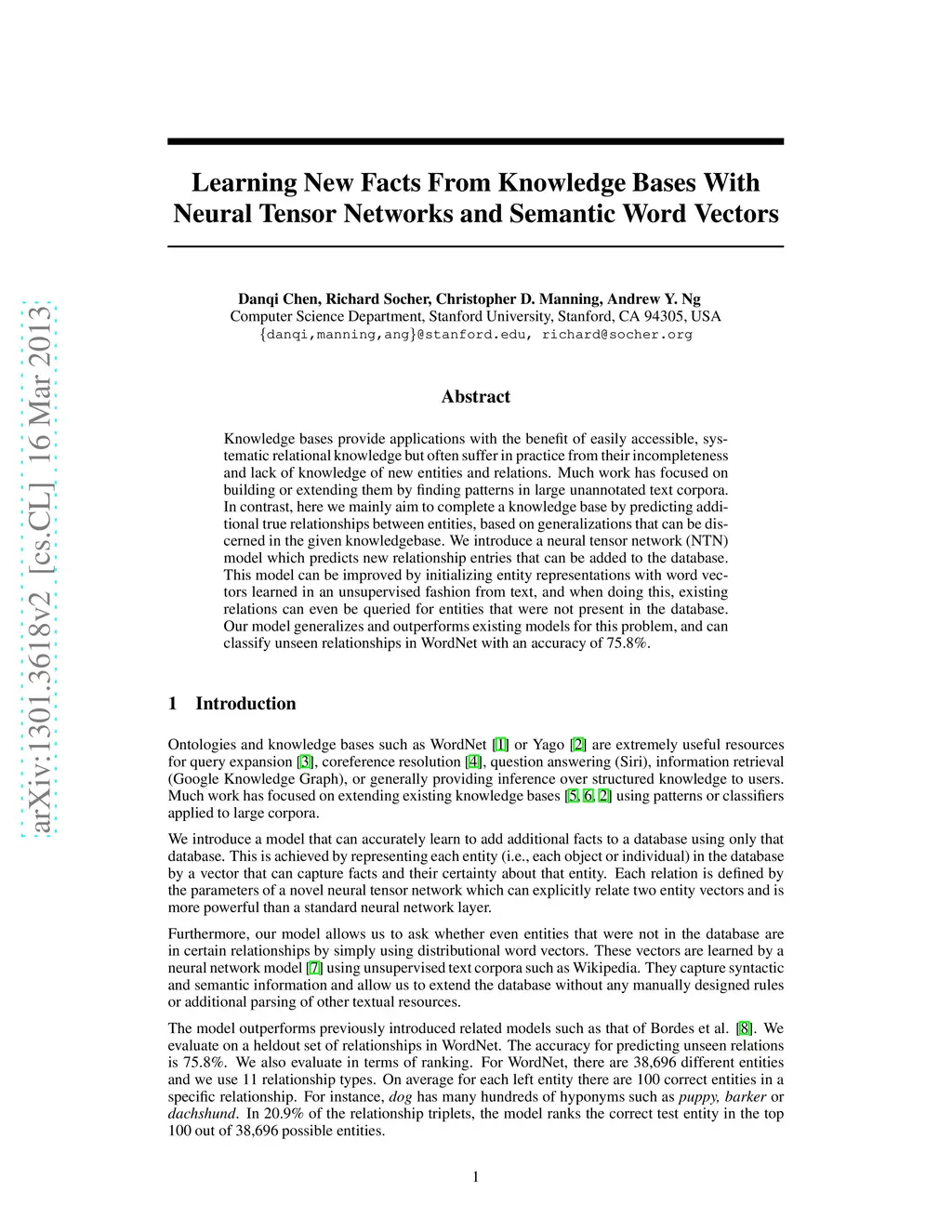 Learning New Facts From Knowledge Bases With Neural Tensor Networks and