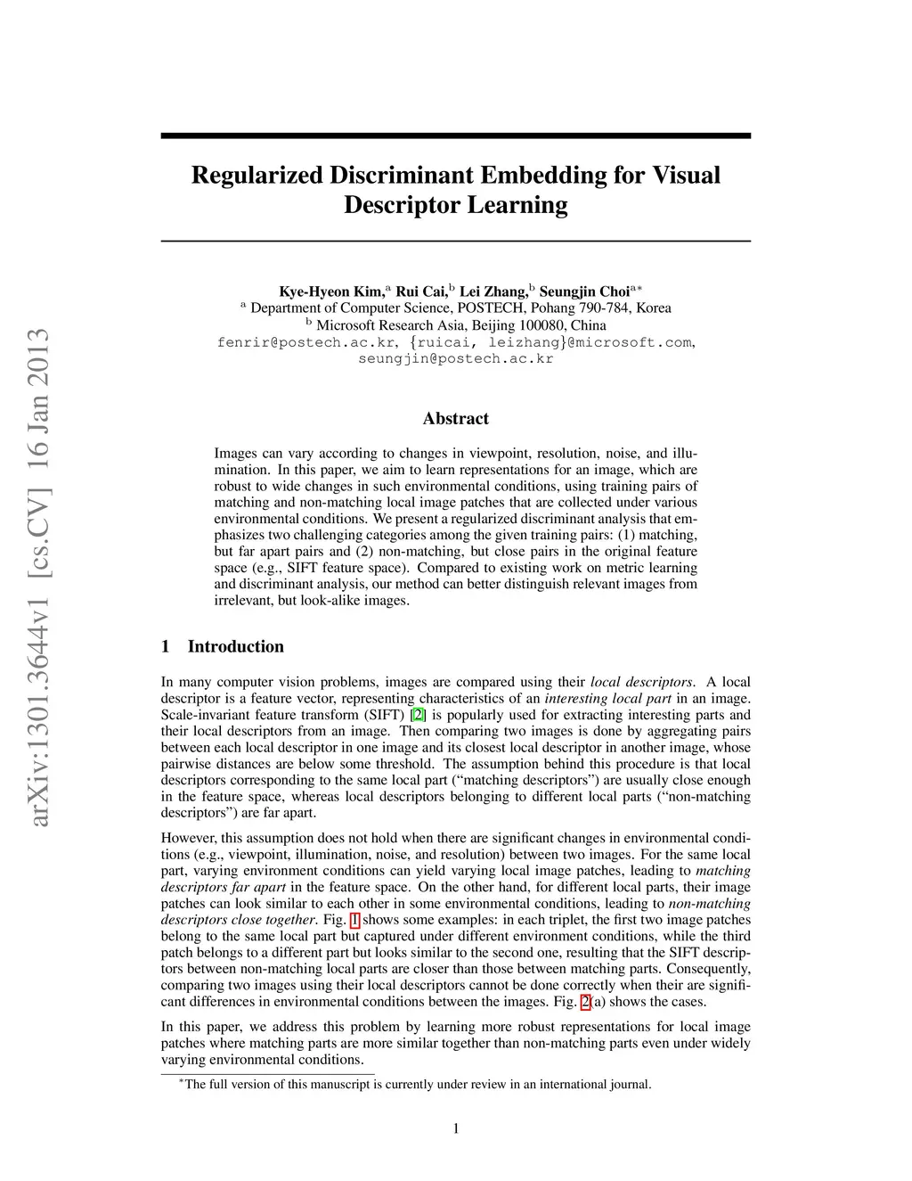 Regularized Discriminant Embedding for Visual Descriptor Learning