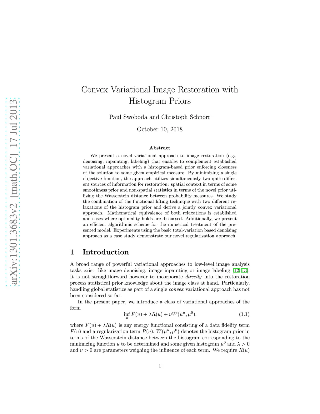 We present a novel variational approach to image restoration (e.g., denoising, inpainting, labeling) that enables to complement established variational approaches with a histogram-based prior enforcing closeness of the solution to some given empirical measure. By minimizing a single objective function, the approach utilizes simultaneously two quite different sources of information for restoration: spatial context in terms of some smoothness prior and non-spatial statistics in terms of the novel prior utilizing the Wasserstein distance between probability measures. We study the combination of the functional lifting technique with two different relaxations of the histogram prior and derive a jointly convex variational approach. Mathematical equivalence of both relaxations is established and cases where optimality holds are discussed. Additionally, we present an efficient algorithmic scheme for the numerical treatment of the presented model. Experiments using the basic total-variation based denoising approach as a case study demonstrate our novel regularization approach.