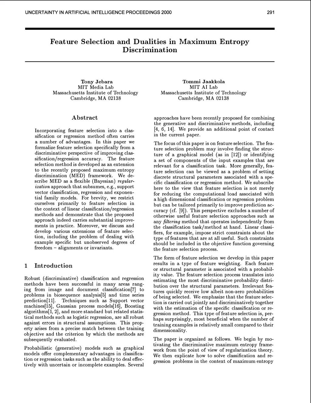 Incorporating feature selection into a classification or regression method often carries a number of advantages. In this paper we formalize feature selection specifically from a discriminative perspective of improving classification/regression accuracy. The feature selection method is developed as an extension to the recently proposed maximum entropy discrimination (MED) framework. We describe MED as a flexible (Bayesian) regularization approach that subsumes, e.g., support vector classification, regression and exponential family models. For brevity, we restrict ourselves primarily to feature selection in the context of linear classification/regression methods and demonstrate that the proposed approach indeed carries substantial improvements in practice. Moreover, we discuss and develop various extensions of feature selection, including the problem of dealing with example specific but unobserved degrees of freedom -- alignments or invariants.