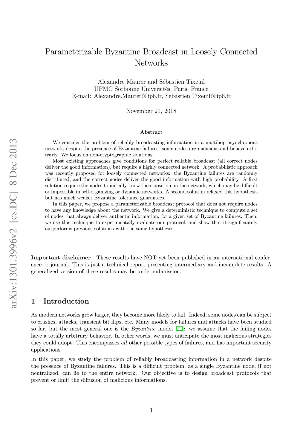 We consider the problem of reliably broadcasting information in a multihop asynchronous network, despite the presence of Byzantine failures: some nodes are malicious and behave arbitrarly. We focus on non-cryptographic solutions. Most existing approaches give conditions for perfect reliable broadcast (all correct nodes deliver the good information), but require a highly connected network. A probabilistic approach was recently proposed for loosely connected networks: the Byzantine failures are randomly distributed, and the correct nodes deliver the good information with high probability. A first solution require the nodes to initially know their position on the network, which may be difficult or impossible in self-organizing or dynamic networks. A second solution relaxed this hypothesis but has much weaker Byzantine tolerance guarantees. In this paper, we propose a parameterizable broadcast protocol that does not require nodes to have any knowledge about the network. We give a deterministic technique to compute a set of nodes that always deliver authentic information, for a given set of Byzantine failures. Then, we use this technique to experimentally evaluate our protocol, and show that it significantely outperforms previous solutions with the same hypotheses. Important disclaimer: these results have NOT yet been published in an international conference or journal. This is just a technical report presenting intermediary and incomplete results. A generalized version of these results may be under submission.