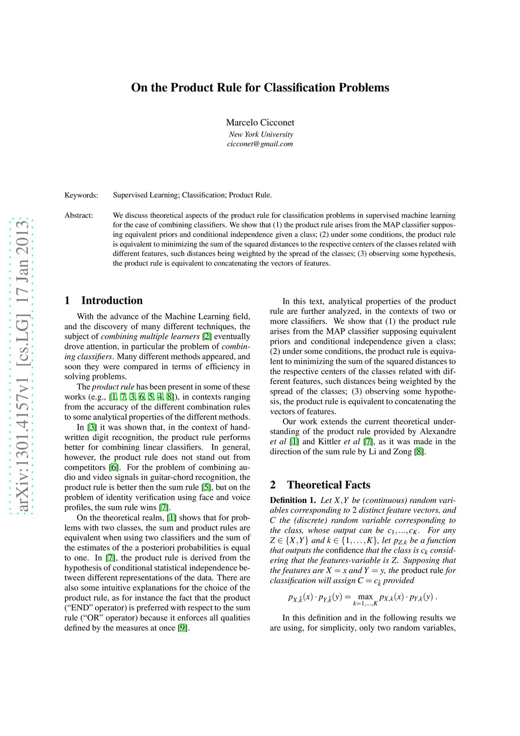 We discuss theoretical aspects of the product rule for classification problems in supervised machine learning for the case of combining classifiers. We show that (1) the product rule arises from the MAP classifier supposing equivalent priors and conditional independence given a class; (2) under some conditions, the product rule is equivalent to minimizing the sum of the squared distances to the respective centers of the classes related with different features, such distances being weighted by the spread of the classes; (3) observing some hypothesis, the product rule is equivalent to concatenating the vectors of features.