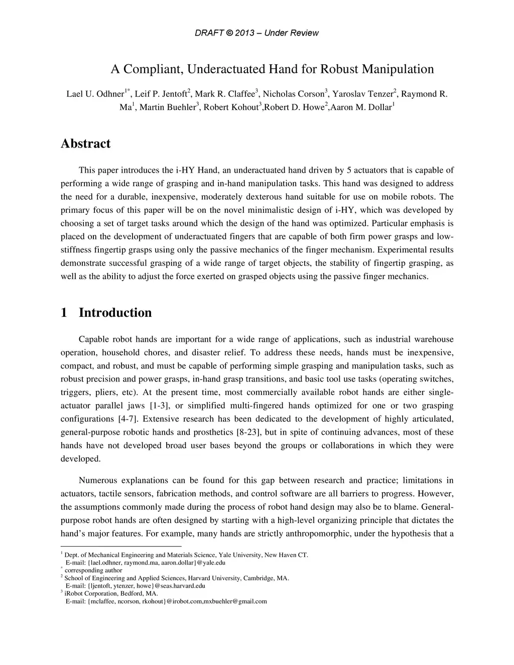 This paper introduces the i-HY Hand, an underactuated hand driven by 5 actuators that is capable of performing a wide range of grasping and in-hand manipulation tasks. This hand was designed to address the need for a durable, inexpensive, moderately dexterous hand suitable for use on mobile robots. The primary focus of this paper will be on the novel minimalistic design of i-HY, which was developed by choosing a set of target tasks around which the design of the hand was optimized. Particular emphasis is placed on the development of underactuated fingers that are capable of both firm power grasps and low- stiffness fingertip grasps using only the passive mechanics of the finger mechanism. Experimental results demonstrate successful grasping of a wide range of target objects, the stability of fingertip grasping, as well as the ability to adjust the force exerted on grasped objects using the passive finger mechanics.