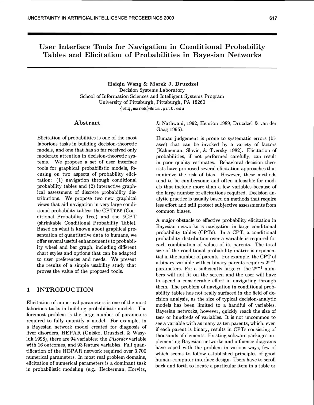 Elicitation of probabilities is one of the most laborious tasks in building decision-theoretic models, and one that has so far received only moderate attention in decision-theoretic systems. We propose a set of user interface tools for graphical probabilistic models, focusing on two aspects of probability elicitation: (1) navigation through conditional probability tables and (2) interactive graphical assessment of discrete probability distributions. We propose two new graphical views that aid navigation in very large conditional probability tables: the CPTree (Conditional Probability Tree) and the SCPT (shrinkable Conditional Probability Table). Based on what is known about graphical presentation of quantitative data to humans, we offer several useful enhancements to probability wheel and bar graph, including different chart styles and options that can be adapted to user preferences and needs. We present the results of a simple usability study that proves the value of the proposed tools.
