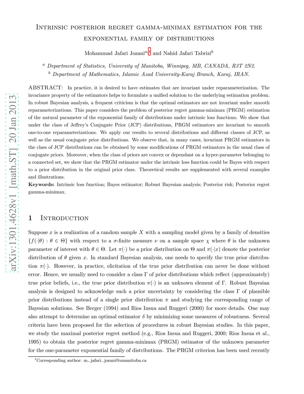 In practice, it is desired to have estimates that are invariant under reparameterization. The invariance property of the estimators helps to formulate a unified solution to the underlying estimation problem. In robust Bayesian analysis, a frequent criticism is that the optimal estimators are not invariant under smooth reparameterizations. This paper considers the problem of posterior regret gamma-minimax (PRGM) estimation of the natural parameter of the exponential family of distributions under intrinsic loss functions. We show that under the class of Jeffrey's Conjugate Prior (JCP) distributions, PRGM estimators are invariant to smooth one-to-one reparameterizations. We apply our results to several distributions and different classes of JCP, as well as the usual conjugate prior distributions. We observe that, in many cases, invariant PRGM estimators in the class of JCP distributions can be obtained by some modifications of PRGM estimators in the usual class of conjugate priors. Moreover, when the class of priors are convex or dependant on a hyper-parameter belonging to a connected set, we show that the PRGM estimator under the intrinsic loss function could be Bayes with respect to a prior distribution in the original prior class. Theoretical results are supplemented with several examples and illustrations.
